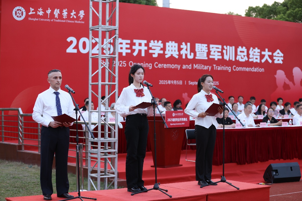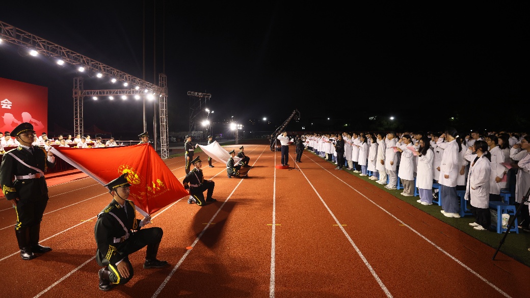 在校党委书记曹锡康的带领下,全体新生面向校旗和红十字会会旗庄严宣誓,立志为建设健康中国和振兴中医药事业贡献青春力量。
