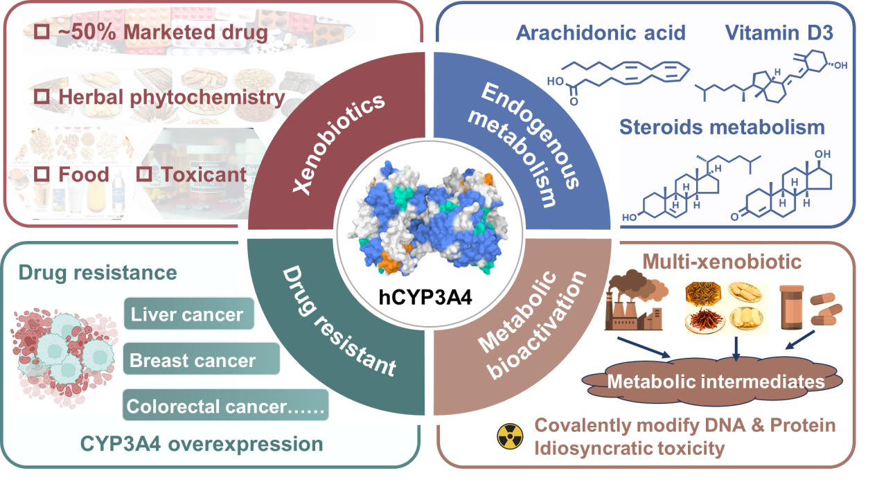 细胞色素P450 3A4(CYP3A4)是人体最重要的药物代谢酶之一,其负责多种外源物(如药物、环境化学物和毒素)和内源性化合物(如类固醇、胆汁酸、脂肪酸和维生素D)的氧化代谢。CYP3A4抑制剂不仅能够显著提高其底物药物的生物利用度和疗效,还有助于逆转部分化疗药物的耐药性。因此,该类抑制剂在临床精准治疗、优化联合用药方案以及推动个性化治疗发展等方面具有重要的应用价值。