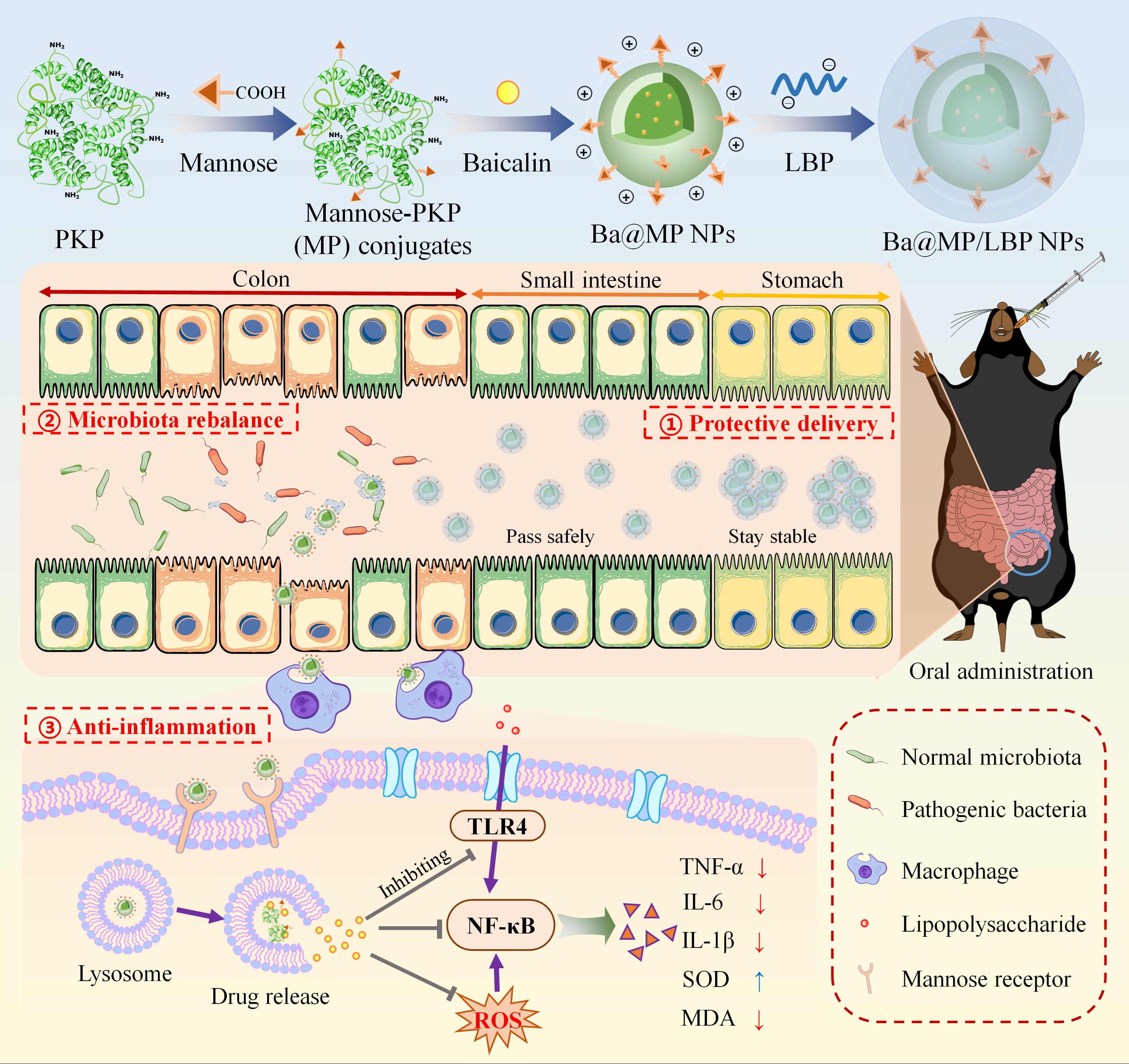 基于该发现,团队在桃仁蛋白(PKP)骨架上引入巨噬细胞靶向配体甘露糖(Man),构建具有两亲性的MP纳米载体装载黄芩苷,从而增强其水溶性并赋予其巨噬细胞靶向能力。为实现结肠特异性递药,进一步将枸杞多糖(LBP)通过静电吸附作用包裹在纳米粒表面,形成具有结肠靶向功能的复合纳米粒。结果显示,该纳米粒可富集于结肠部位并靶向炎症巨噬细胞,进而抑制促炎因子分泌、减轻氧化应激水平,并促进肠道微环境稳态恢复,最终缓解结肠炎症状。