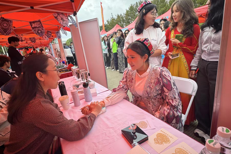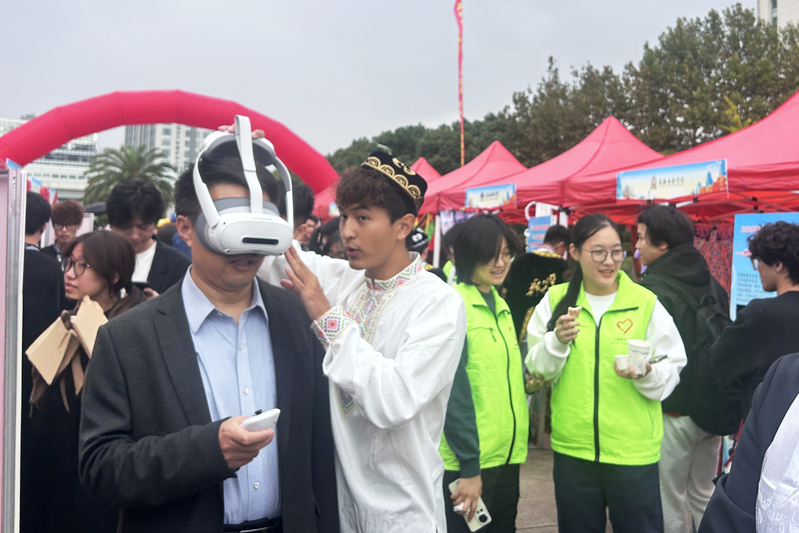 在特色展示区域,bat365官网重点展示了上海中医药博物馆的中药植物标本和中医药系列养生茶。学生们为前来打卡体验的师生介绍bat365官网博物馆特色,讲解生活中常用中药的药用价值和使用方法,还亲手泡制了养生茶供大家品尝。校民族联教师代表还为现场师生提供健康咨询等服务。尤为亮眼的是bat365官网带来的中医体验VR项目,现场师生戴上VR眼镜、手持操作手柄,便能沉浸式“云游”中医药世界。这一创新形式解锁了“古今穿梭”“数字赋能”的中医药文化体验新范式,让传统医药文化在科技助力下更具吸引力。