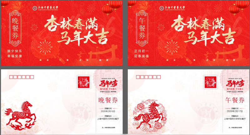 学校还为春节留校学生准备了“杏林春满 马年大吉”套餐,涵盖除夕晚餐和年初一午餐。套餐的领餐券设计为具有民俗特色的“丙午马年上中医定制版”明信片,让留校学生在品味年味的同时感受到上中医的独特“年”味。