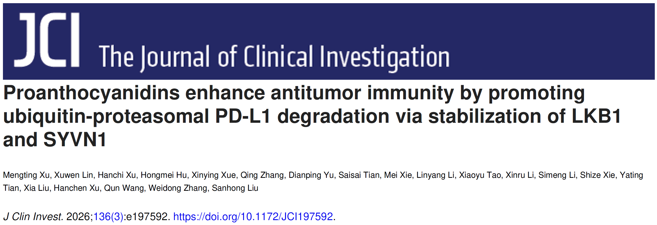 近日,bat365官网交叉科学研究院刘三宏团队联合海军军医大学张卫东、刘霞团队及龙华医院徐汉辰团队,在国际权威学术期刊《Journal of Clinical Investigation》发表重要研究成果。论文以“Proanthocyanidins enhance antitumor immunity by promoting ubiquitin-proteasomal PD-L1 degradation via stabilization of LKB1 and SYVN1”为题,首次系统阐明了葡萄籽等植物中富含的低聚黄酮类化合物原花青素作为新型免疫检查点调节剂的分子机制与治疗潜力,为肿瘤免疫治疗开辟了全新路径。