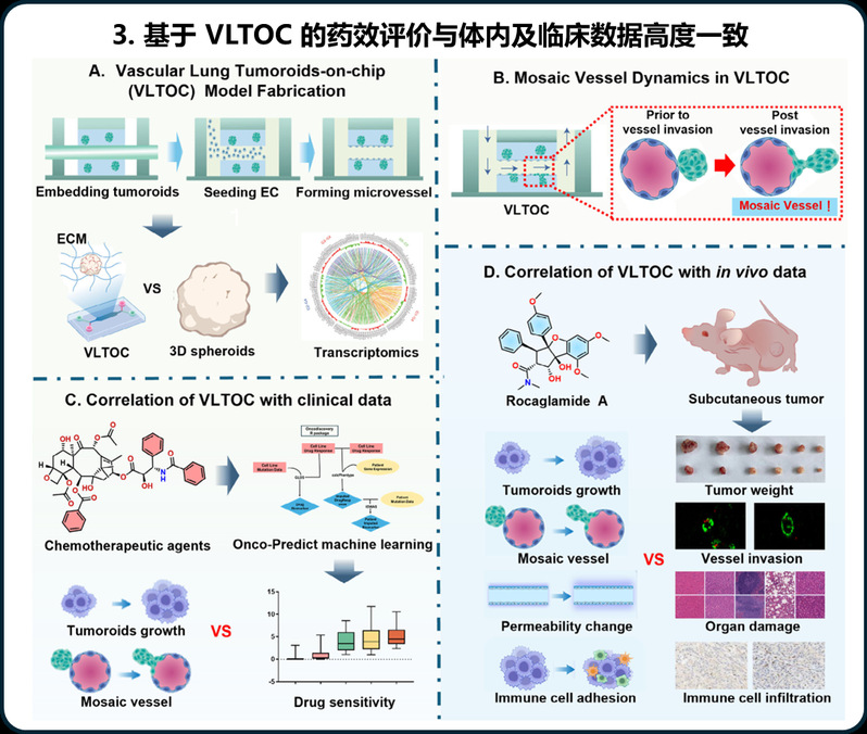 基于VLTOC模型,研究团队构建了同步表征肿瘤生长、血管嵌合体动力学及健康血管损伤的多参数药效评价体系。借助该体系对临床常用化疗药物的抗肺癌转移能力进行评价,发现嵌合血管扩张抑制率与TCGA患者数据库来源的药物敏感性预测结果高度相关,且显著优于肿瘤生长抑制等经典指标。在此基础上,研究团队还开展了中药活性成分楝酰胺的抗肺癌转移能力研究,发现该化合物在芯片中呈现抑制嵌合血管、保护血管完整性、促进免疫细胞粘附的三重药效特征。进一步的动物实验证实VLTOC平台可用于新型抗NSCLC迁移药物的疗效评估与脱靶毒性预警。