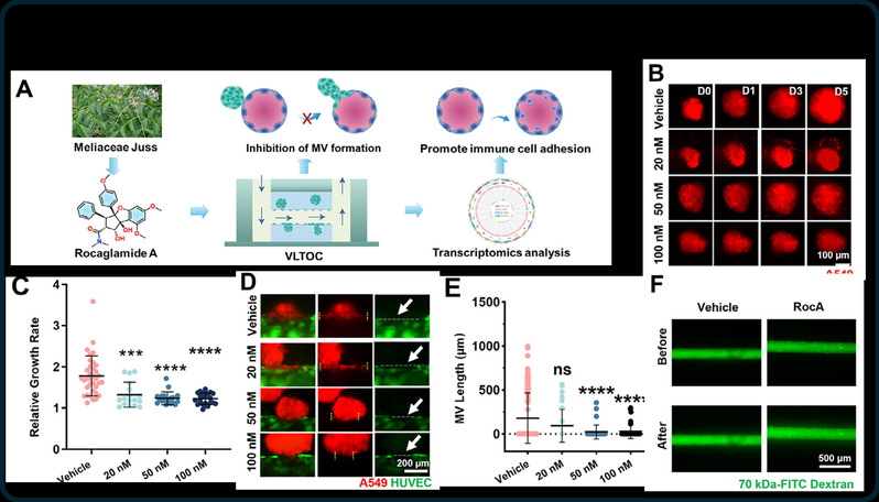非小细胞肺癌(NSCLC)患者的5年生存率仅为5%,而肿瘤转移是导致患者死亡的主要原因。血管是NSCLC转移的主要通道,阻断肿瘤细胞通过血管系统实现转移是抑制NSCLC转移的重要策略。然而,目前常用的肺癌体外模型普遍缺乏具备高仿生特性的血管结构,难以真实模拟肿瘤与血管之间的相互作用,也无法动态再现肿瘤转移的关键过程,这严重制约了抗转移药物疗效的精准评估。针对上述瓶颈,bat365官网交叉科学研究院葛广波、郭兆彬团队借助微流控芯片等前沿技术,构建了一种新型血管-肺癌类器官芯片(Vascularized Lung Tomoroid-on-Chip, VLTOC),其可高仿生模拟肿瘤-血管嵌合体的形成、EPR效应等肿瘤转移关键事件。进一步借助荧光成像、超高分辨成像等技术对上述关键事件进行单细胞分辨率的原位实时追踪。组学分析显示VLTOC中肿瘤细胞增殖、代谢、侵袭及血管生成相关通路显著上调,较传统3D肿瘤球更贴近恶性进展表型,并揭示了细胞骨架动态重塑是驱动肺癌血管嵌合体形成的关键因素。