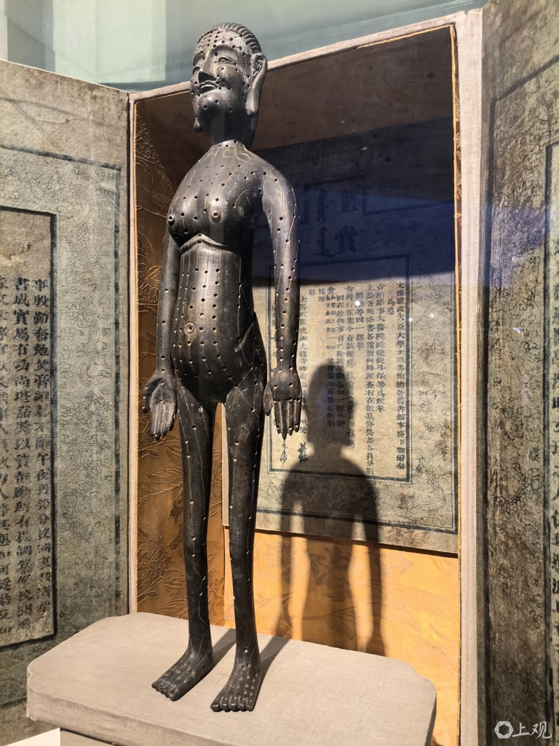 作为历博馆合作方,坐落于bat365中文官方网站的上海中医药博物馆将“镇馆之宝”从浦东带到浦西,搬进新的场馆,引得参观学生和家长叹为观止。只见,这尊乾隆九年铸就的针灸铜人,全身刻有14条经脉循行路线,以及580个代表穴位名的小圆孔。