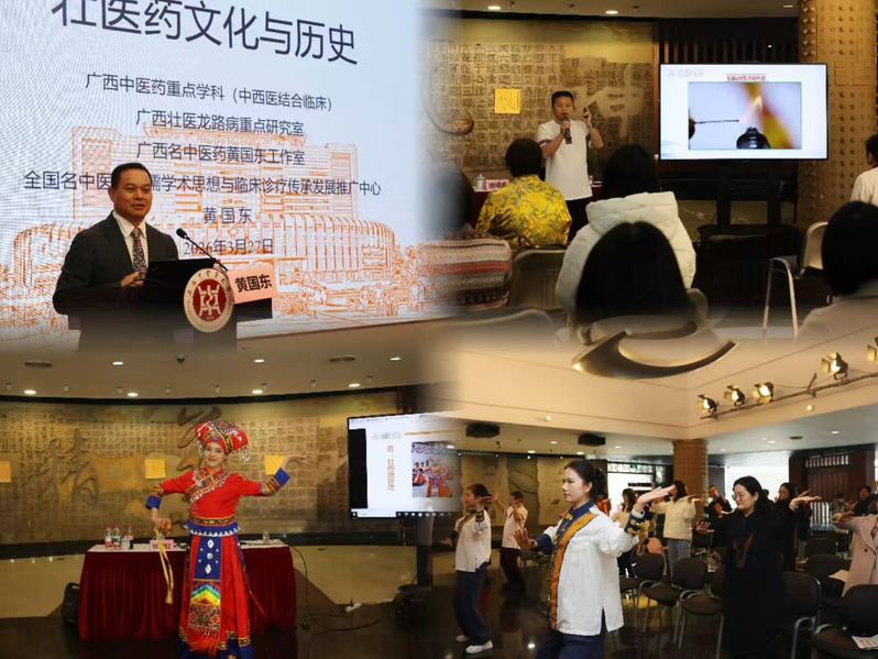 以展览为媒,沪桂两地中医药院校和医疗机构深入开展传统医药学术交流研讨和医疗合作。巡展前夕,广西国际壮医医院与上海市闵行区中西医结合医院开展了深入的交流合作。双方就壮医药特色技法与中西医结合诊疗的融合进行了深入探讨,为沪桂两地医疗合作搭建了专业平台。广西国际壮医医院院长黄国东为bat365中文官方网站师生带来“壮医药历史与文化”专题讲座,他从壮医药文化的发展载体、发展历程、时代回响三大维度展开,让师生对壮医药的历史底蕴、文化价值与现代发展有了全面且深刻的认识。
