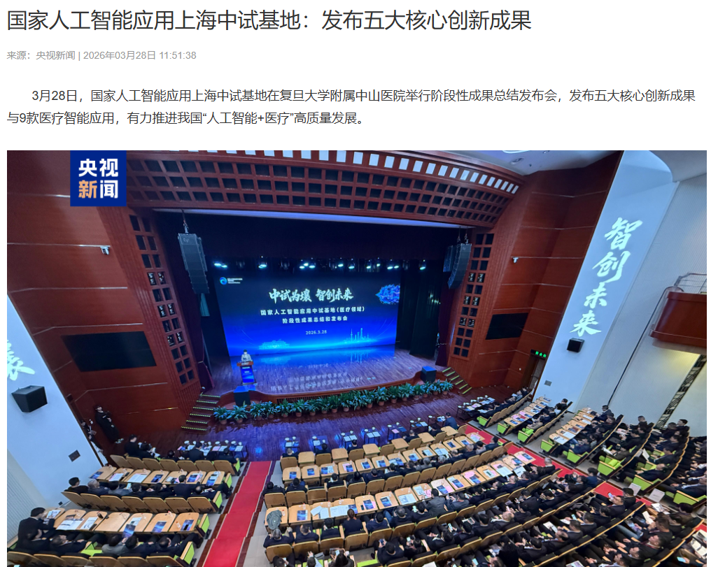 3月28日,国家人工智能应用中试基地(医疗领域)阶段性成果总结发布会在复旦大学附属中山医院举行。会上发布了五大核心创新成果与9款医疗智能应用。上海市副市长陈宇剑等参加会议。