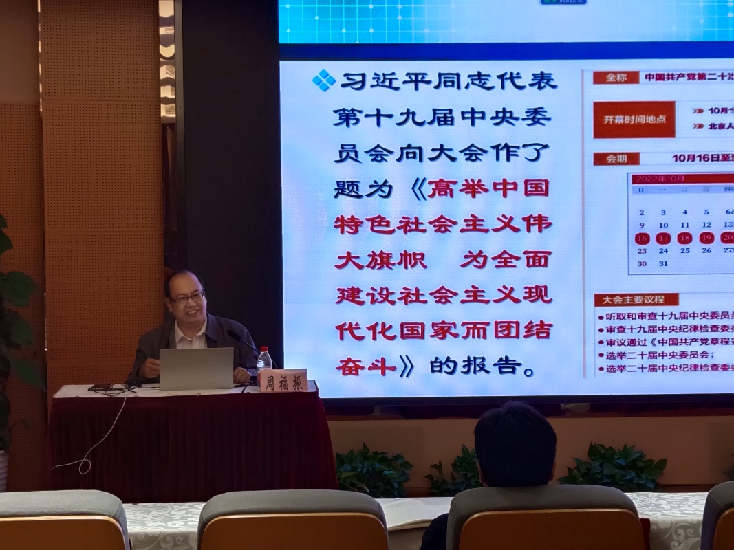 为深入学习宣传贯彻党的二十大精神,引领研究院师生在学深悟透中汲取奋进力量,1111日,交叉科学研究院在行政楼301报告厅举办“深入学习宣传贯彻党的二十大精神”专题学习,特邀“杏马”理论宣讲团成员、马克思主义学院教授周福振作主题为“健全全面从严治党体系——学习二十大党章”的专题辅导报告。本次学习会由交叉科学研究院党委书记祝建龙主持。