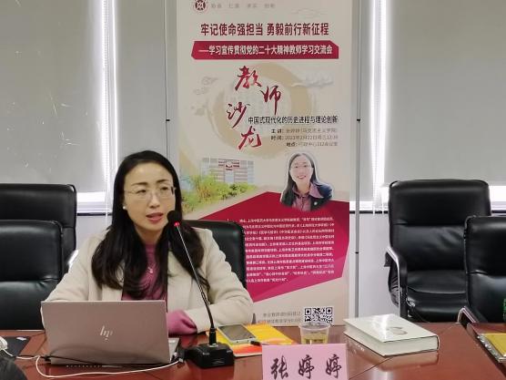 为持续深入学习宣传贯彻党的二十大精神,引导广大青年教师从党的二十大精神中汲取奋进的力量,2月22日下午,“牢记使命强担当 勇毅前行新征程——深入学习宣传贯彻党的二十大精神”专题系列第三期教师学习交流会暨第35期“杏林有约”教师午间沙龙在行政中心312会议室举办。bat365官网“杏马”理论宣讲团成员、马克思主义学院副院长张婷婷副教授受邀作专题辅导报告,主题为“中国式现代化的历史进程与理论创新”。宣传部(党委教师工作部)副部长刘虹主持会议,并向张婷婷颁发“阳光导师”荣誉证书。教师党支部书记、青年教师班主任等40余位教师参加学习交流。