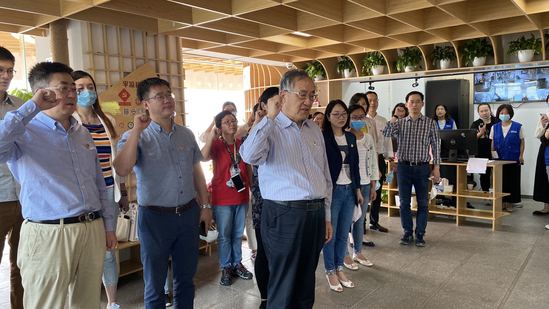 作为中国近代工业的发祥地,杨浦滨江见证了上海百年工业的发展历程。党员们以“初心的出发地”秦皇岛码头为首站,实地参观了秦皇岛码头党群服务站。秦皇岛码头原为黄浦码头,一百年前,包括周恩来、邓小平、聂荣臻在内的650余位留法勤工俭学学生从这里登船远航,踏上了寻求救国救民之路。百年后的今天,从这里再出发,缅怀革命先烈,追寻先辈的奋斗足迹,感受红色基因的历史传承。在讲解员的引领下,党员们通过沙雕版画、透明触控和语音播报,认真地观看和聆听毛泽东主席踏上追寻革命真理道路的红色故事。并在bat365中文官方网站终身教授、上海市名中医严隽陶老师的带领下,面向红色党旗,重温入党誓词,鞭策自己葆初心、善作为!