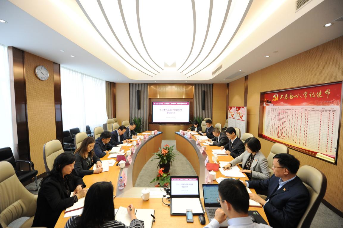 校党委常委许铁峰、王拥军、徐瑶玲等同志围绕本职工作,就“充分理解基本经济制度的创新内涵”“强化提高人民健康水平的制度保障”等内容进行研讨。与会人员认为,十九届四中全会彰显了以制度为核心,推进国家治理体系和治理能力现代化的决心;彰显了继续深化改革、扩大开放的决心;彰显了党要管党、全面从严治党的决心。