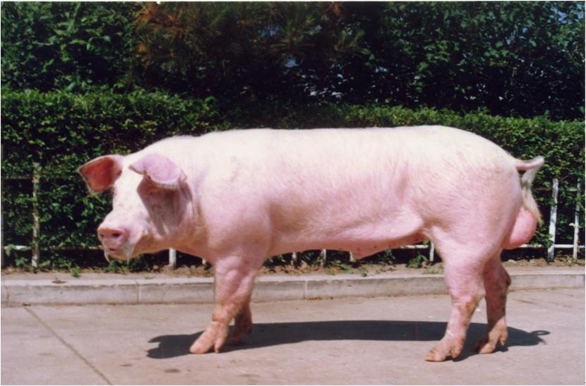军牧1号白猪,毛色全白,头中等大小,耳朵中等大小、前倾,面额平直,肩宽背平,体躯较长,四肢粗壮,臀部丰满宽平,体格强健。母猪平均窝产活仔10.76头,生长育肥期平均日增重810g,饲料转化率为3.0:1,胴体瘦肉率64%,第6、7肋间眼肌的肌内脂肪含量3.5%。