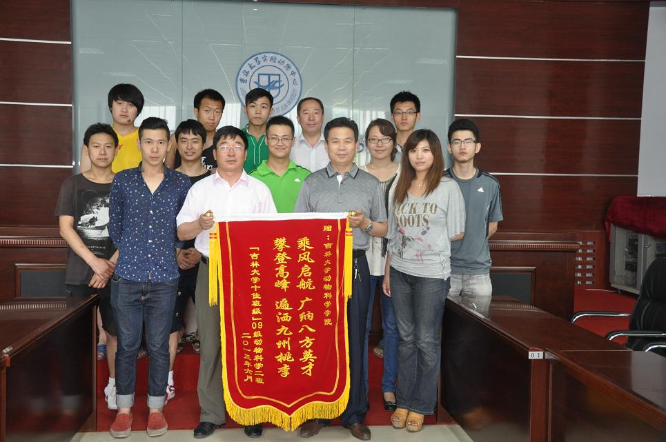 6月28日下午2:30,beat365英国官方网站2009级动物科学2班毕业生在离校之际向学院赠送了锦旗。学院院长张嘉保教授、党委书记赵光军老师、党委副书记曹伟光老师、毕业班辅导员肖建荣及部分毕业生代表参加了此次赠予仪式。