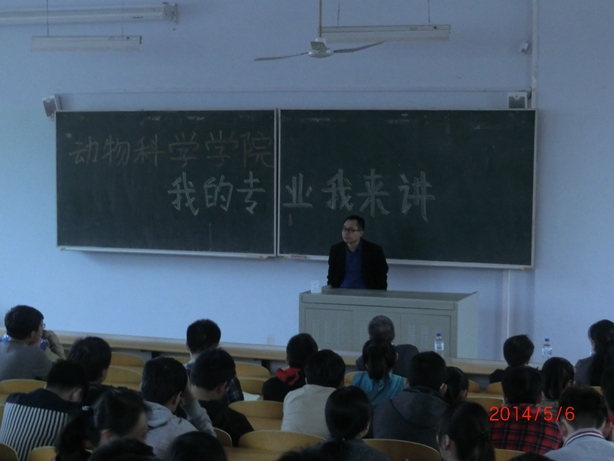 2014年5月6日晚6:00,beat365英国官方网站“我的专业我来讲”主题活动在科学讲堂100教室开讲了。由于电路维修,学部预定的恢复供电没能如约而至,但作为第一场主讲嘉宾:动物科学专业周虚教授携课题组成员李纯锦、陈璐两位老师却如约为2013级全体同学带来了一场别开生面的、在黑暗中指引光明的专业互动,党委副书记曹伟光、辅导员肖建荣也都到场进行了学习。