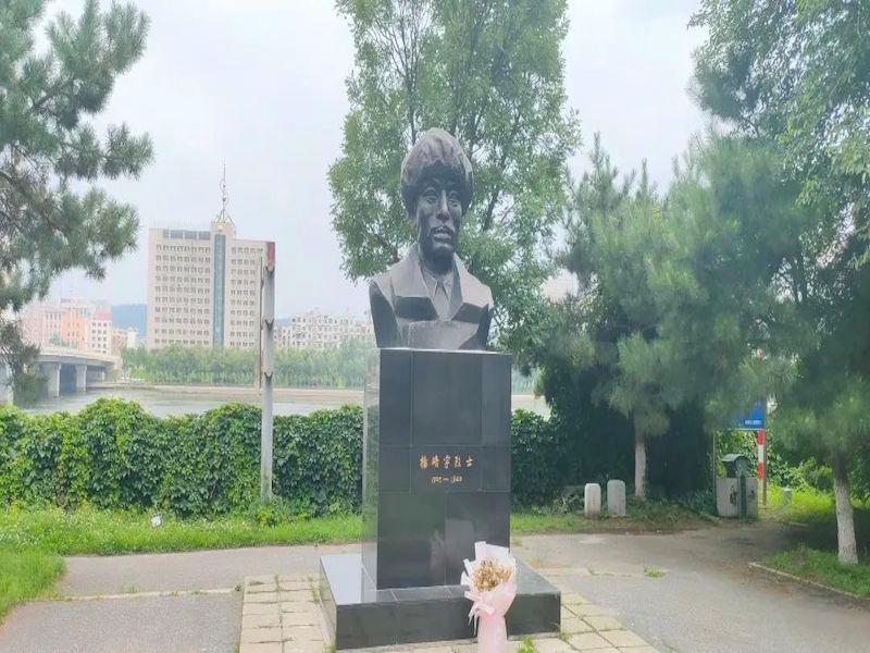 团队成员赵乾宇和李笠华来到位于辽宁抚顺的杨靖宇将军纪念碑处进行参观学习。基座正面镌刻“杨靖宇烈士”五个醒目大字,背面镌刻烈士简介。杨靖宇雕像为半身像,头带皮帽子,上身着皮大衣,庄严且肃穆。团队在纪念碑处驻足凝望,深鞠一躬。