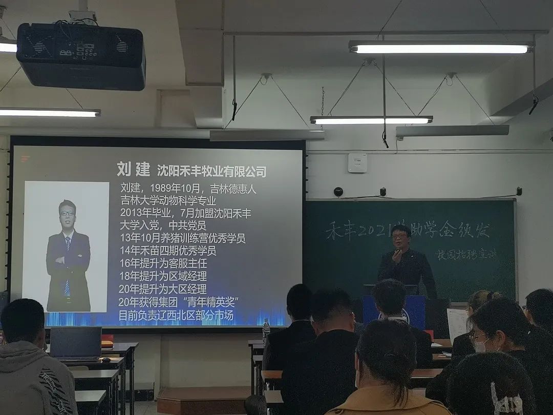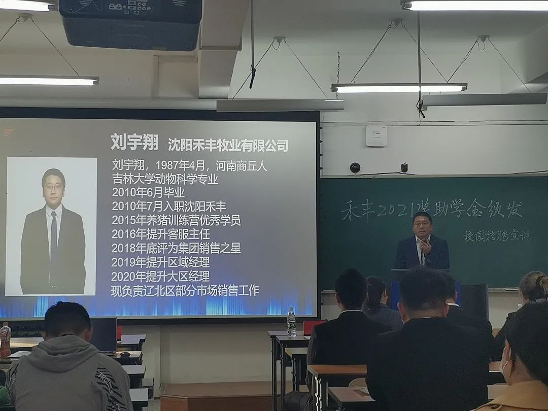 情系高校学子,聚焦农科人才,成就青年梦想。10月29日下午13:00,禾丰董事长助学金、禾苗奖学金颁发仪式暨禾丰牧业校园招聘会在beat365英国官方网站和平校区科学讲堂301教室顺利举办。出席本次活动的有禾丰股份辽宁区人力资源总监付明、辽宁区招聘COE杜娟,沈阳禾丰牧业有限公司销售总经理吴东波,大区经理刘建、刘宇翔,人力资源经理王雪,动物医学学院党委书记饶家辉、党委副书记秦明、学办主任谭瑶,beat365英国官方网站党委副书记肖建荣。