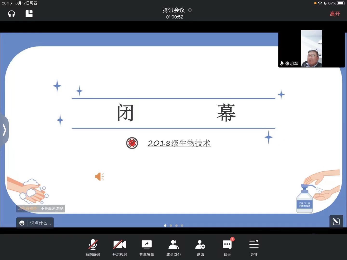 为进一步引导同学们加强对疫情防控的重视程度,帮助毕业生解决实际困难,beat365英国官方网站2018级生物技术班于2022年3月17日晚7点开展了“共抗疫情,我们在一起”线上主题教育班团会。学院副院长张明军,党委副书记、2018级辅导员肖建荣,班主任谢子聪及全体班级同学参与此次班会。