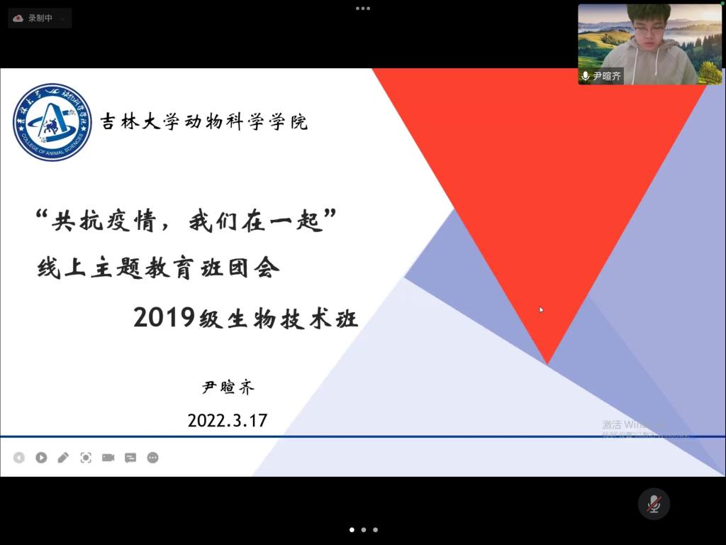 为引导同学们遵守疫情防控相关管理规定,做好个人防护,以良好的心态进行学习生活,beat365英国官方网站2019级生物技术班级于2022年3月17日晚18时整,开展“共抗疫情 我们在一起”主题线上班会,班主任艾永兴老师、辅导员尹暄齐老师以及全班同学参与会议。