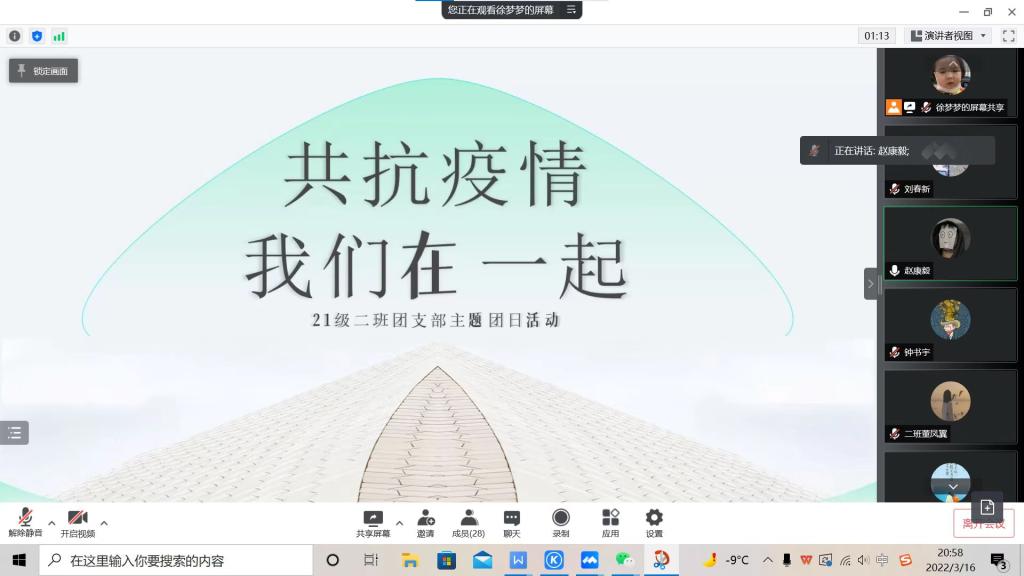 为落实学校疫情防控封闭管理期间各项工作的要求,凝聚班级同学抗疫力量,传播科学抗疫知识,beat365英国官方网站2021级2班于3月18日召开了“共抗疫情,我们在一起”线上主题教育班团会。辅导员王可佳老师,班级全体同学参加班会。