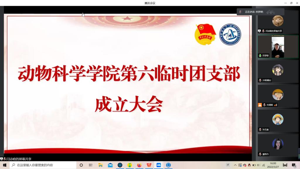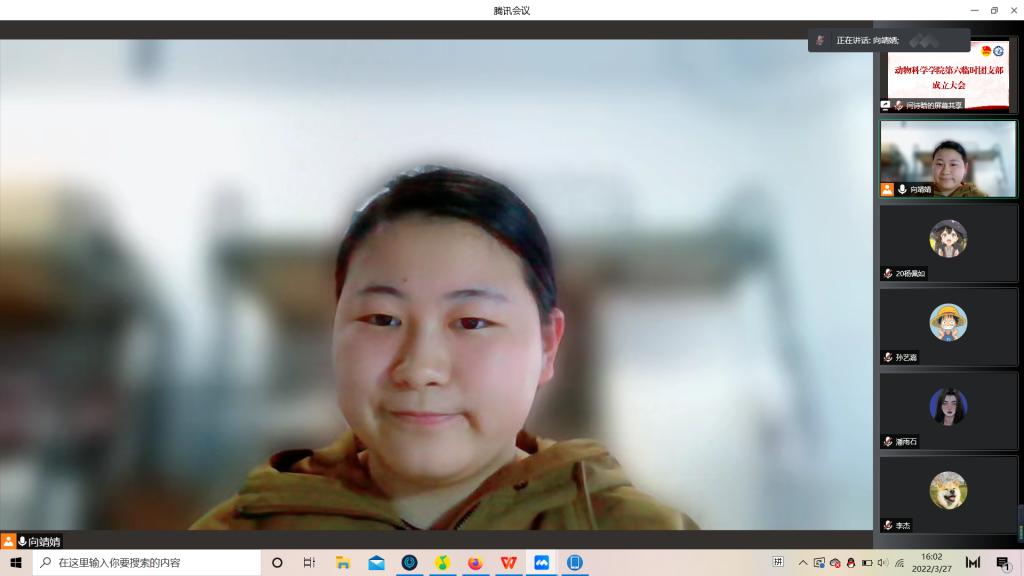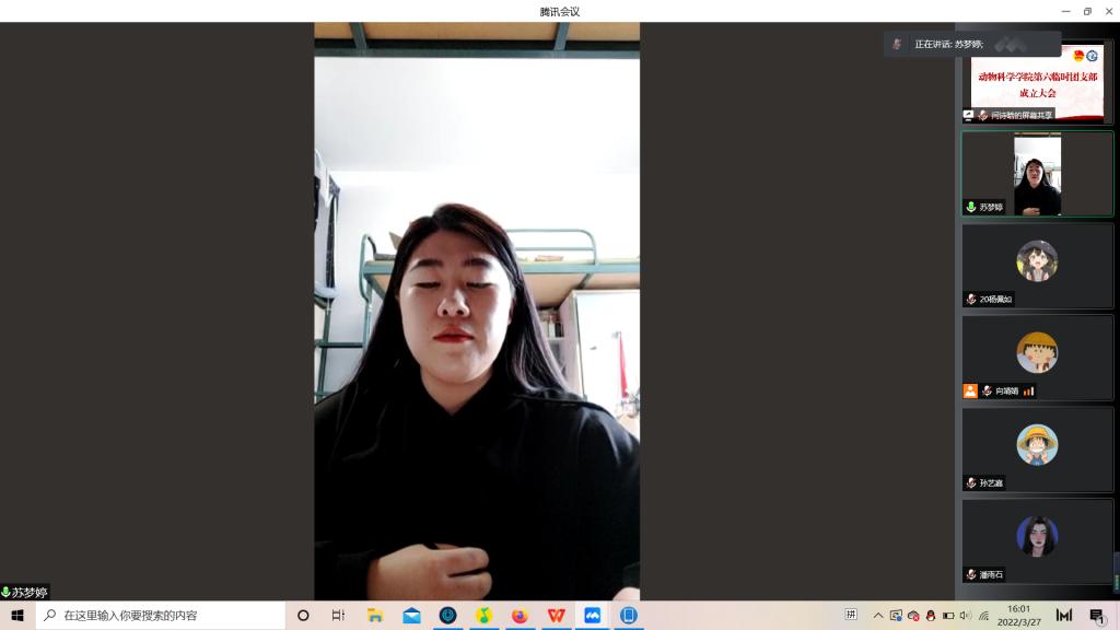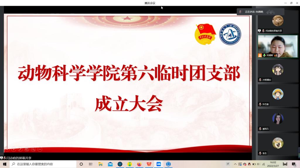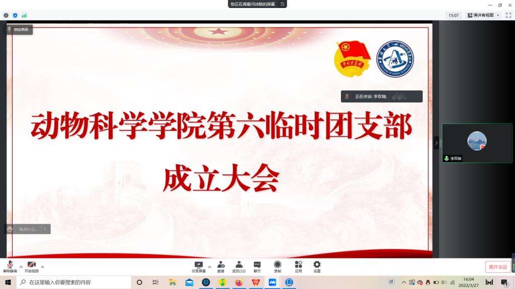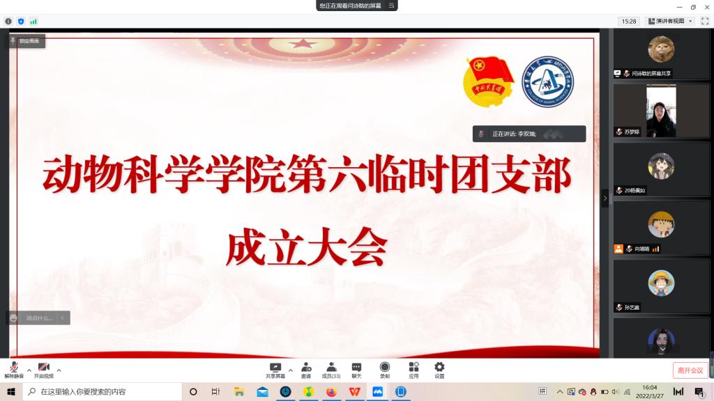 为积极响应校团委号召,强化团的基层建设,切实发挥共青团组织在防疫控疫工作中的战斗堡垒作用及团员的先锋模范作用,落实《关于疫情防控期间成立临时团支部的通知》的工作安排,beat365英国官方网站第六临时团支部成立大会于3月29日下午四点由支部书记苏梦婷主持召开。支部全体成员即2018级、2019级实验动物班和2020级一班和平二公寓共34名同学参会。