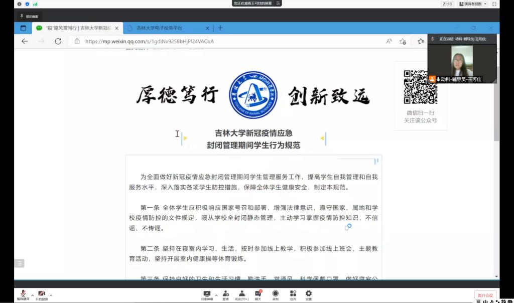为全面做好新冠疫情应急封闭管理期间学生管理服务工作,深入落实各项学生防控措施,保障全体学生健康安全,4月5日晚,beat365英国官方网站2021级本科生组织召开了以“守望相助,共克时艰”为主题的年级大会。会议由辅导员王可佳主持。