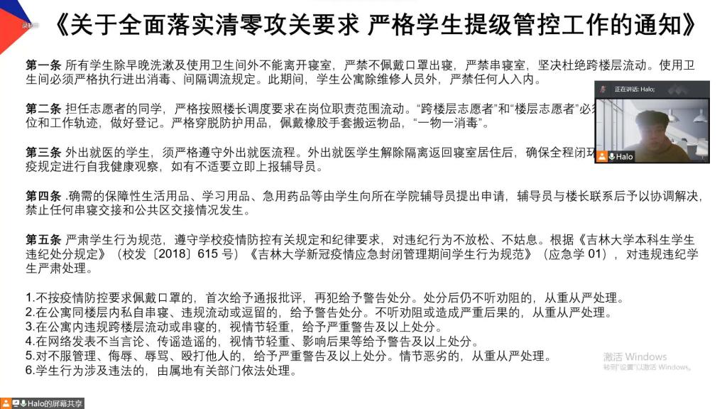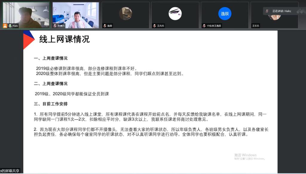 会议伊始,尹暄齐老师为同学们解读了学校发布的《全面落实清零攻关要求,严格学生提级管控工作》文件精神,他表示:在抗疫的关键时期,同学们一定要严格遵守疫情管控工作细则,落实落细清零攻关任务要求,继续坚持配合属地、学校防疫工作,为争取早日解封打下基础。紧接着,尹暄齐老师向同学们解读了学校最新发布的关于网上订餐的通知,带领同学们认真学习线上订餐流程并提醒同学们注意订餐时间,保证健康的饮食生活习惯。随后,针对隔离期间同学们的网课学习情况,尹暄齐老师通报了上周的查课情况并指出,2019级、2020级同学虽然能保证全员到课,但有踩点、迟到的情况出现,他希望同学们能做到上课提前5分钟进入线上课堂,室友之间互相帮助、互相提醒、共同进步,保持积极的学习态度和良好的学习状态。最后,尹暄齐老师叮嘱同学们在静态封控的生活状态下要注重用电安全和寝室卫生,及时整改安全隐患。