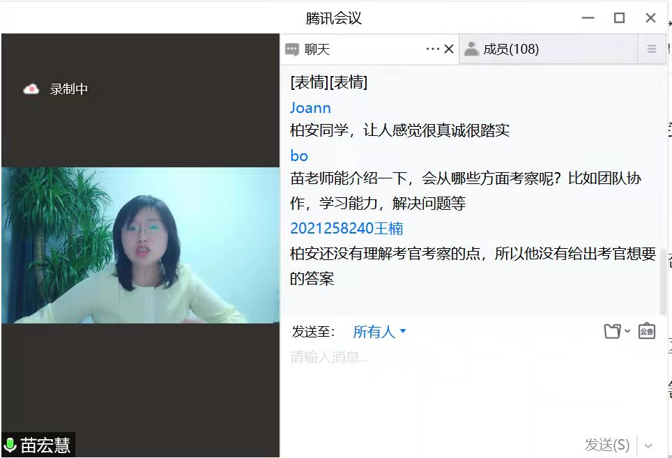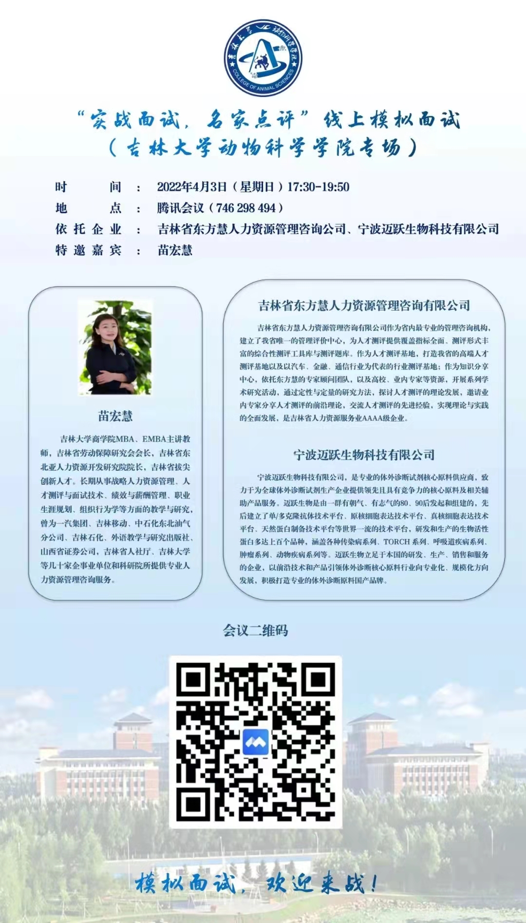 4月3日,学院开展“实战面试 名家点评”线上模拟面试会,邀请beat365英国官方网站商学与管理学院人力资源管理专家苗宏慧老师,宁波迈跃生物科技有限公司总经理、优秀校友牛伟萍女士在线指导,学院180余名师生参会。