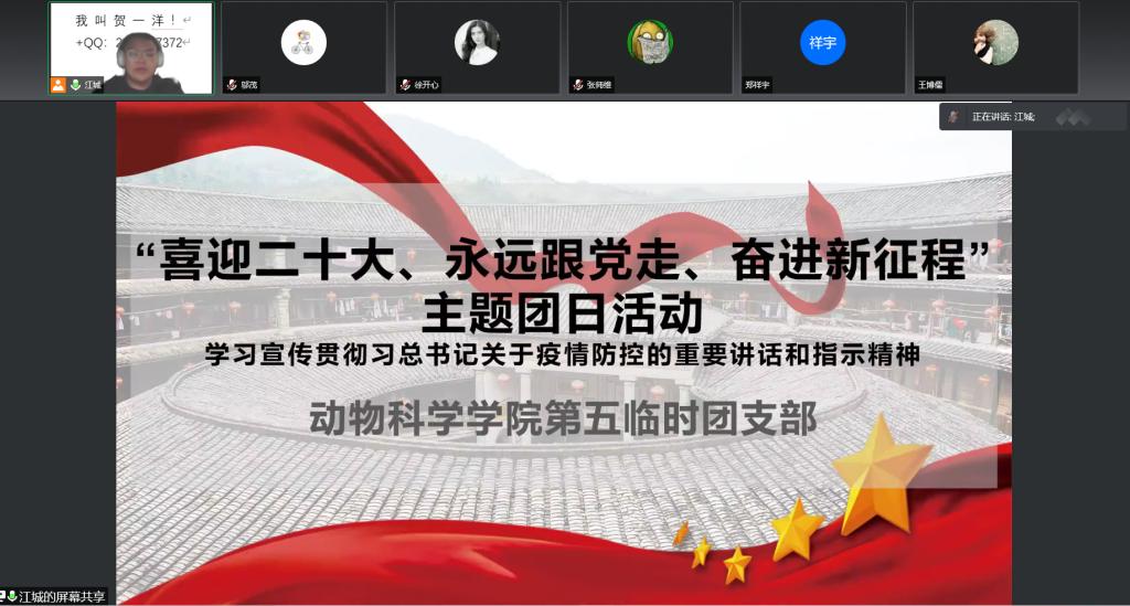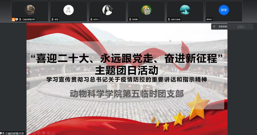为学习宣传贯彻习近平总书记关于疫情防控工作的重要讲话指示精神,认真学习各级党委和政府的疫情防控工作部署,教育广大团员青年遵守疫情防控要求,执行学校、学院疫情防控工作各项规定,学院应校团委要求,指示beat365英国官方网站各临时团支部举办相关主题团日活动。2022年4月3日下午14时,beat365英国官方网站第五临时团支部举办“喜迎二十大、永远跟党走、奋进新征程”主题团日活动。主题团日活动由团支部书记于政石同学主持,第五临时团支部支委会成员以及beat365英国官方网站18级动物科学专业、19级动物科学专业、20级三班全体男生参加活动。