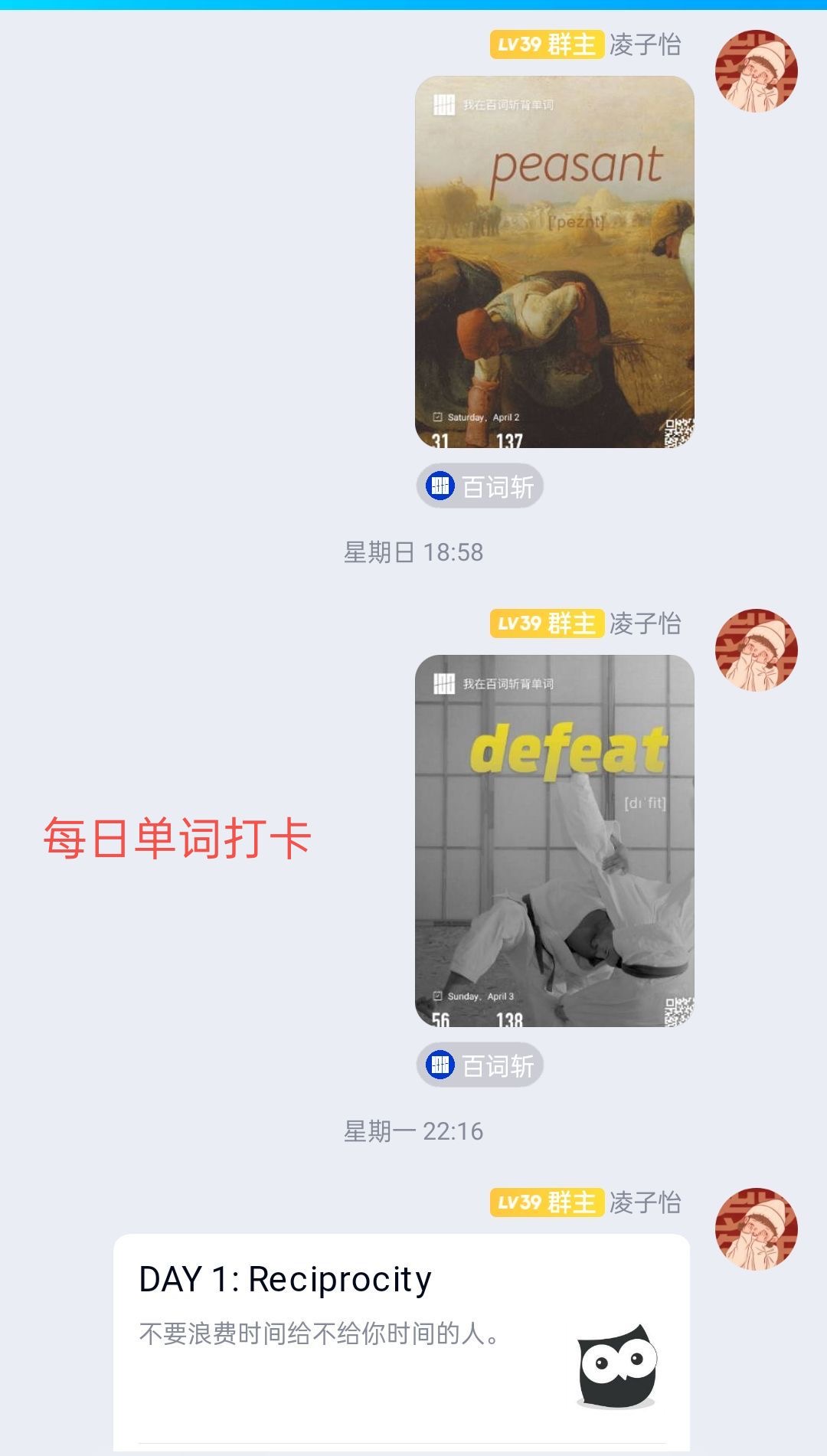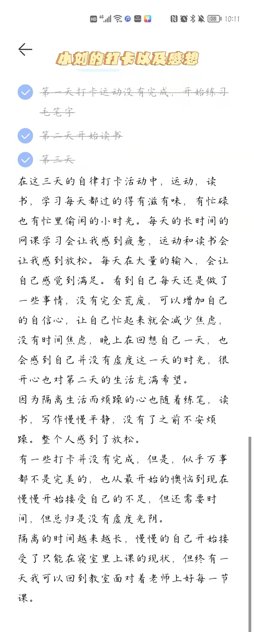 活动结束后,由大家评出“自律之星”,并由“自律之星”分享在这次活动中的收获。有同学说,在活动中,不仅感受到了自律的力量,更感受到了规律作息带来的种种变化;也有同学说,在这次活动中养成了不少好习惯,而这些好习惯成为了她对抗疫情带来的焦躁情绪的武器。