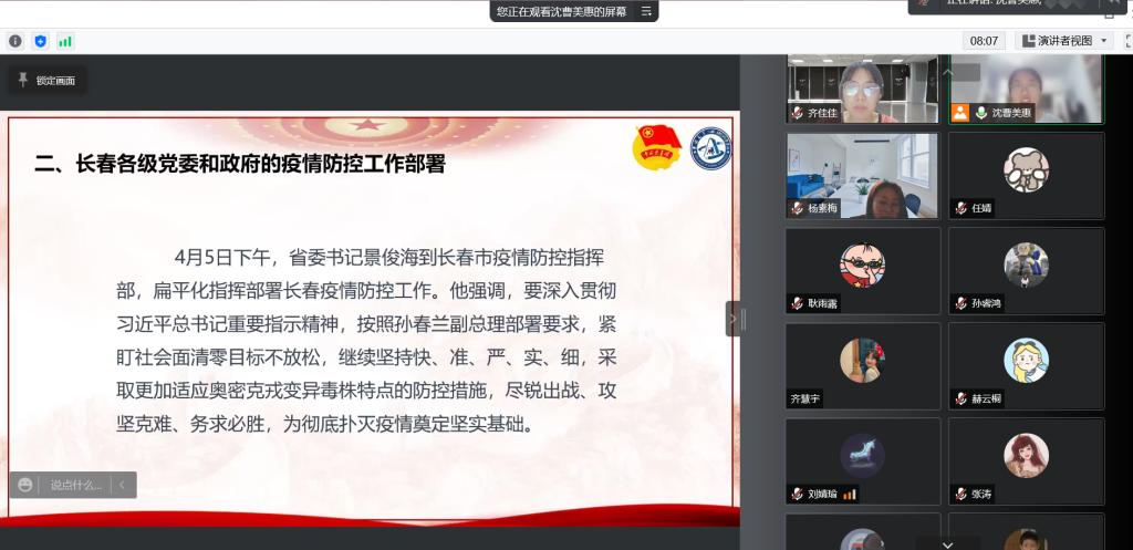 活动第二项,集体学习长春市各级党委和政府对疫情防控工作的部署,全体团员对长春市当前疫情局势有了全面的了解。当前疫情虽有好转,但总体形势依旧严峻,我们万不能掉以轻心。通过此次学习,全体团员更加坚定了响应国家、政府和学校号召的决心。