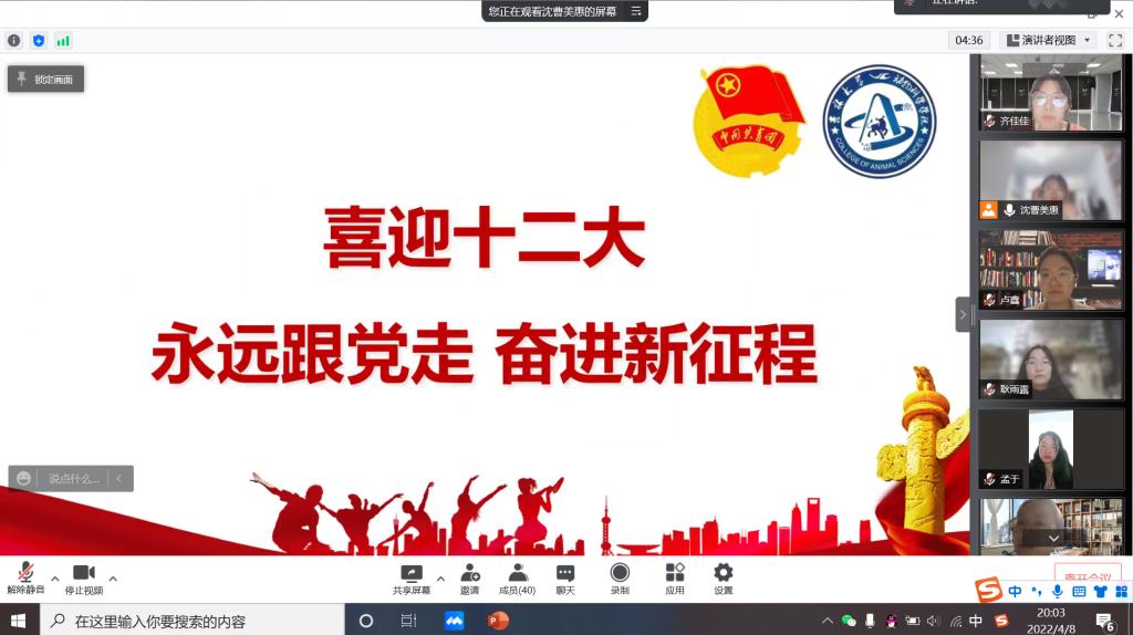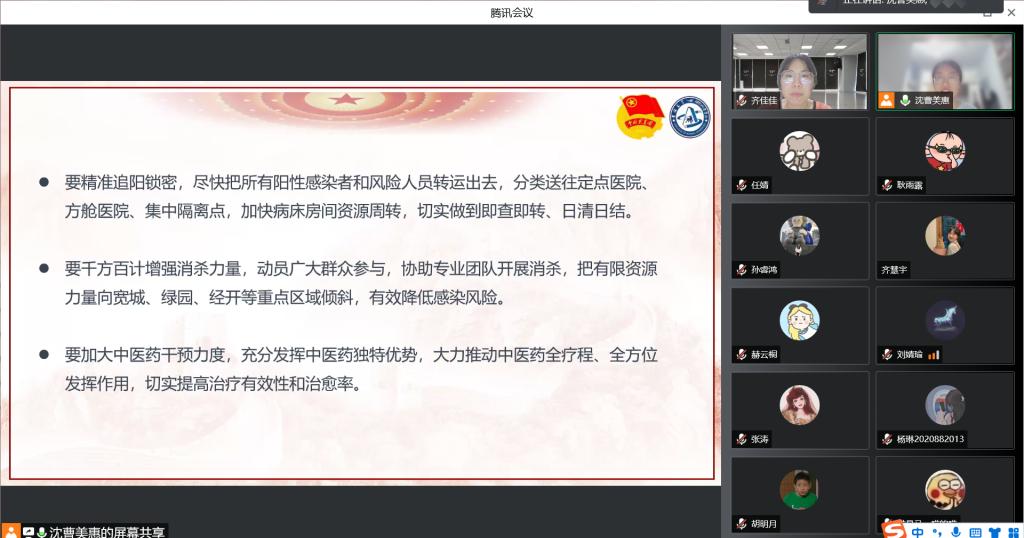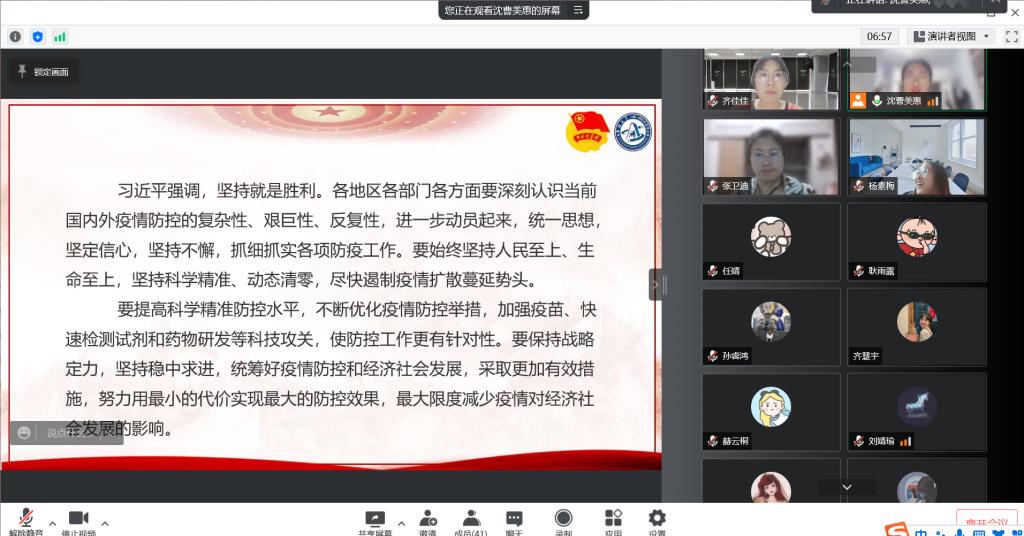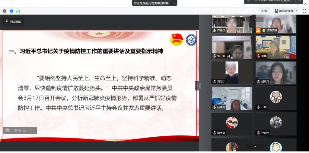 2022年初,一场突如其来的疫情打乱了原本的校园生活秩序。在全面封控的形势下,为坚定共青团员万众一心、共同抗“疫”的理想信念,培养爱党爱团的家国情怀,学习贯彻习近平总书记关于疫情防控工作的重要讲话精神,beat365英国官方网站第十一临时团支部于4月8日晚20点开展“喜迎十二大,永远跟党走,奋进新征程”为主题团日活动。本次团课活动借助腾讯会议,以线上形式开展,会议由团支书沈曹美惠主持,支部全体成员参加。