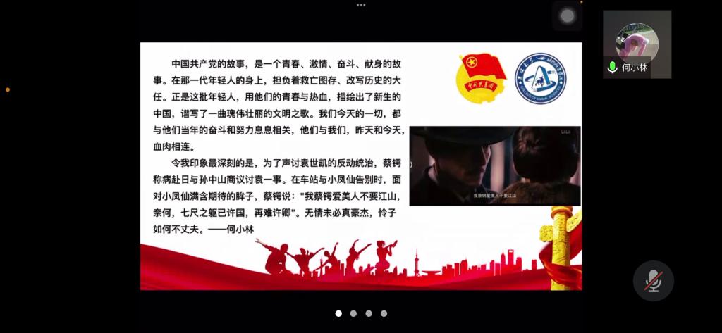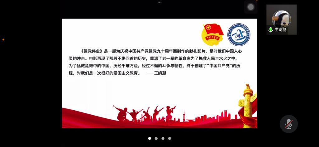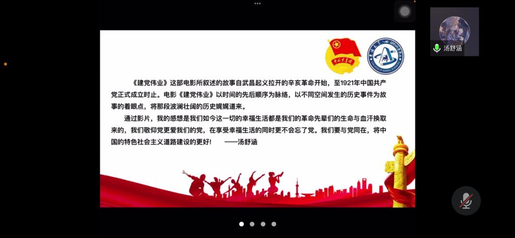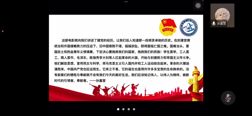 为弘扬爱国主义精神,丰富封校隔离期间学生的生活,加强学生团员的思想教育,使同学们正确认识祖国的历史和现实,增强爱国感情和振兴祖国的责任感,beat365英国官方网站第七临时团支部举办了爱国主义电影《建党伟业》观影活动,并于2022年4月3日下午14时依托腾讯会议召开“《建党伟业》观后感”线上分享会。活动由临时团支部书记苏廖枷域主持,支部全体成员参加。