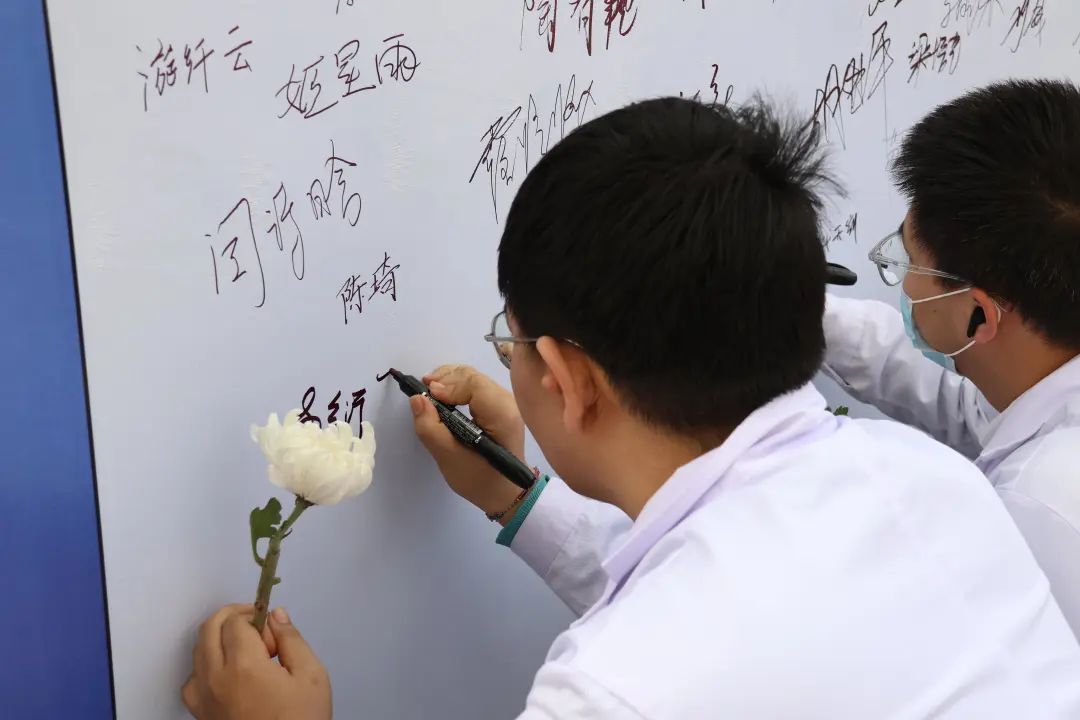 在全体承诺环节,学生代表王皓琪带领到场师生宣读“尊重”承诺辞。到场师生纷纷举起右手,握拳至耳边,庄严承诺“敬畏生命,尊敬生命,善待生命,拯救生命”,活动最后,师生集体静思一分钟,依次走近慰灵碑前敬献鲜花,向为人类健康和生命科学发展做出贡献的无言英雄表达崇高敬意。
