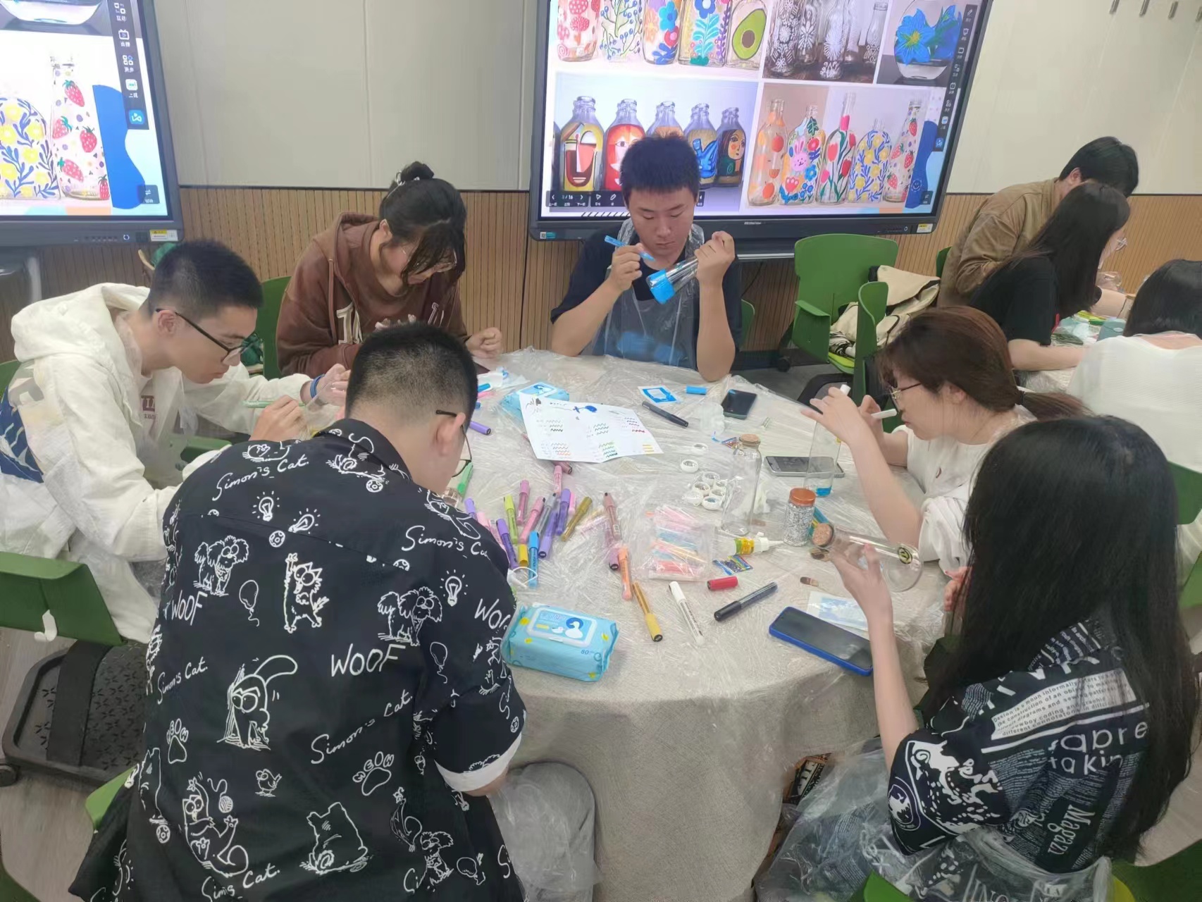 五彩颜料填涂一个个天马行空的创意,一双双巧手绘出内心深处的悲伤与渴望。绘画过程中同学们相互交流,欣赏彼此的画作,彼此真诚赞美,气氛其乐融融。同学们感受到彼此的相同之处,又从其他同学的画作中窥见各自的特别之处。活动最后,同学们相互分享了自己的感悟,为此次活动画上了一个完美的句号。最后,同学们带着自己的玻璃瓶绘画作品合影留念。