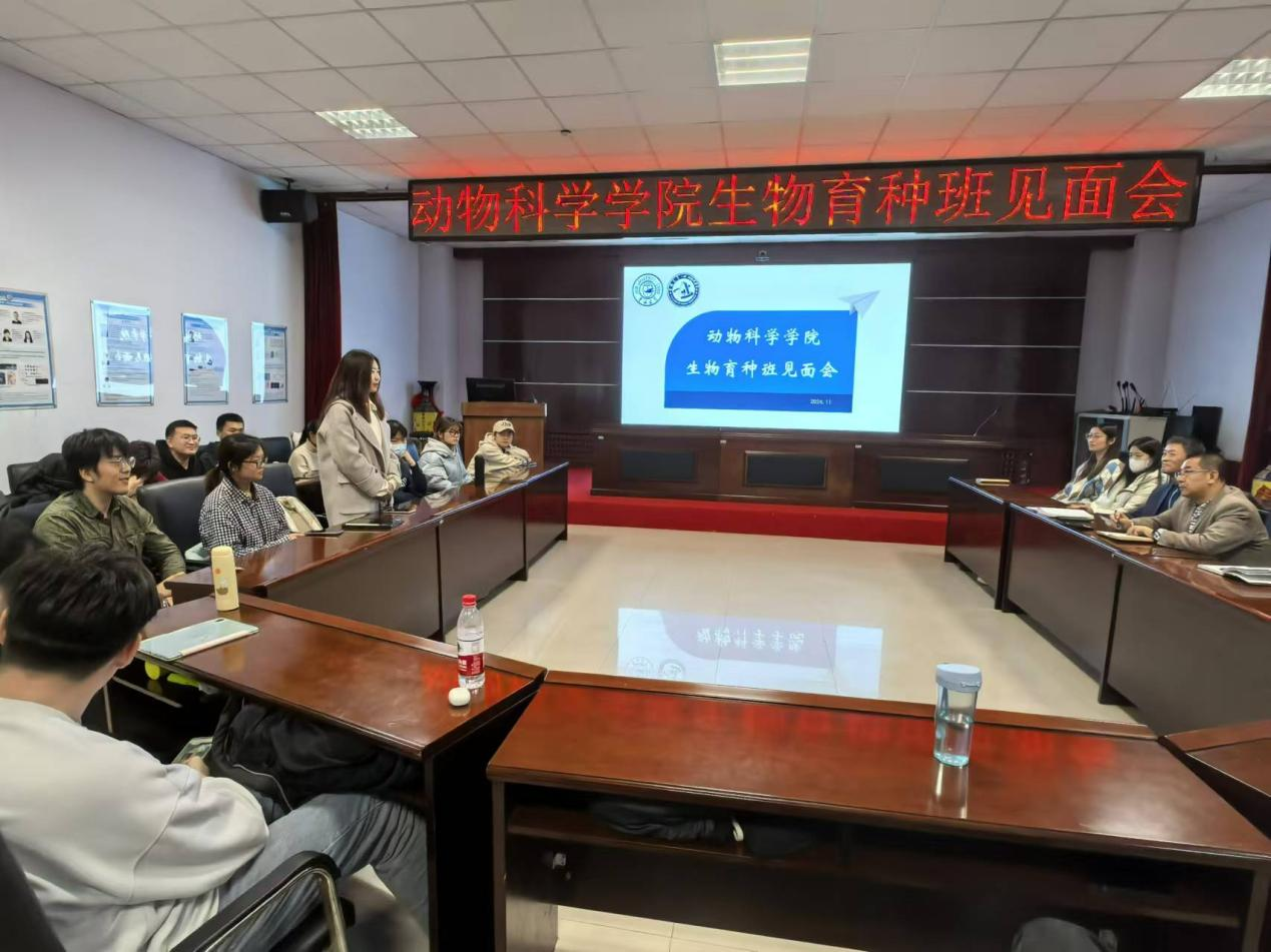 11月11日下午四点beat365英国官方网站于beat365英国官方网站一楼会议室举行生物育种班见面会。参会人员有党委书记高福和、院长孙博兴、副院长李纯锦、副书记兼副院长肖建荣、教学办公室秘书张峭朋、辅导员贾子一,2023级以及2024级动生物育种班全体同学。