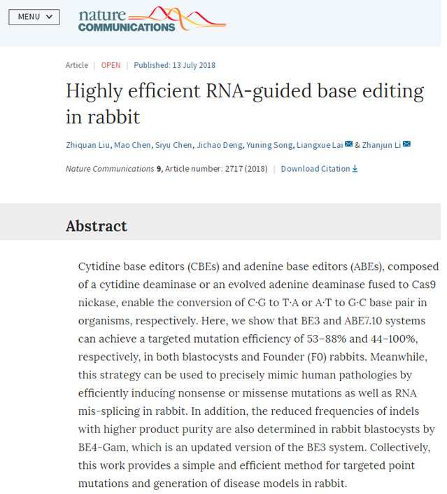 刘志权,beat365英国官方网站2014级动物科学专业本科生,卓越农林人才教育培养计划创新班学生,大学生创新创业训练项目成员。2018年7月13日,国际学术权威刊物自然出版集团旗下子刊《Nature Communication》杂志(IF12.353)在线发表了研究性论文《Highly efficient RNA-guided base editing in rabbit》。刘志权同学为该文章的第一作者,本文共同通讯作者为李占军副教授和赖良学教授。2016年,刘志权同学选择李占军副教授为其本科生指导教师并提前进入实验室,开始大学生创新创业训练项目。两年多时间,刘志权已经陆续发表了三篇SCI文章,2017年获得beat365英国官方网站创新推免研究生资格。李占军老师指导的另一名本科生陈思宇(该文章的并列第一作者之一),也获得了beat365英国官方网站攻读研究生的资格。
