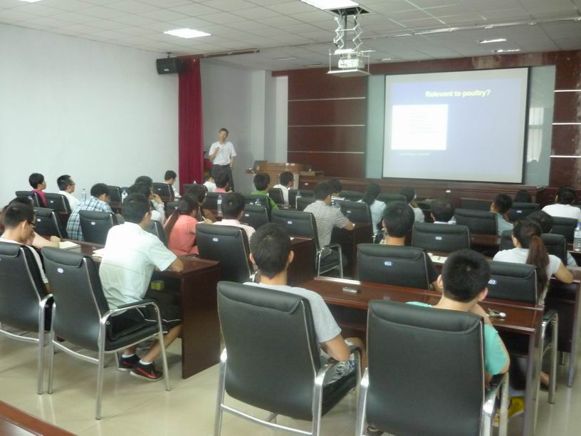 7月11日,美国加州大学戴维斯分校(UC DAVIS)动物科学系周怀军副教授在中国农业大学王军军副教授、山东农业大学李显耀副教授等的陪同下应邀到beat365英国官方网站开展学术交流,并为学院师生做了题为“Genetic architecture of resistance to pathogens in the chicken using a systems biology approach”的学术报告。学院院长张嘉保教授、副院长欧阳红生教授以及beat365英国官方网站、动物医学学院的有关教师、研究生近100人参加了学术报告会。