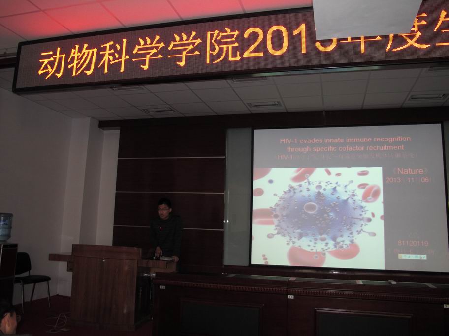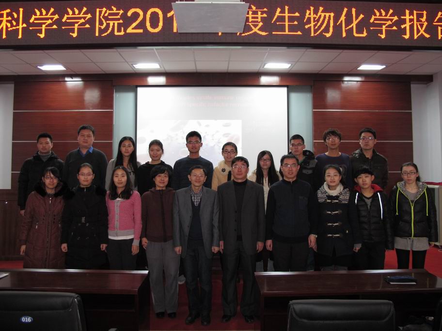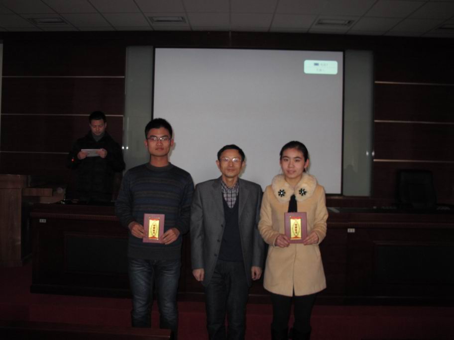 2013年12月27日下午,学院举行了颁奖仪式,并由获奖学生进行了专题汇报报告。院长张嘉保教授,副院长欧阳红生教授,动物生物技术系主任逄大欣教授等领导和老师参加了汇报报告及颁奖会,并为获得一、二、三等奖的史刘歆、吴至竞等12名学生颁发了获奖证书。