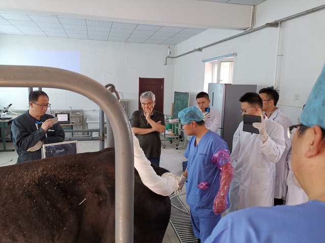 马的OPU技术现场教学演示包括:马的固定;清洗、消毒;麻醉;B超仪器的调试、抽卵机压力调试;抽卵操作;另一侧卵巢抽卵;结束消毒。马的活体采卵结束后,Il-keun Kong教授又在牛上进行活体采卵实验。