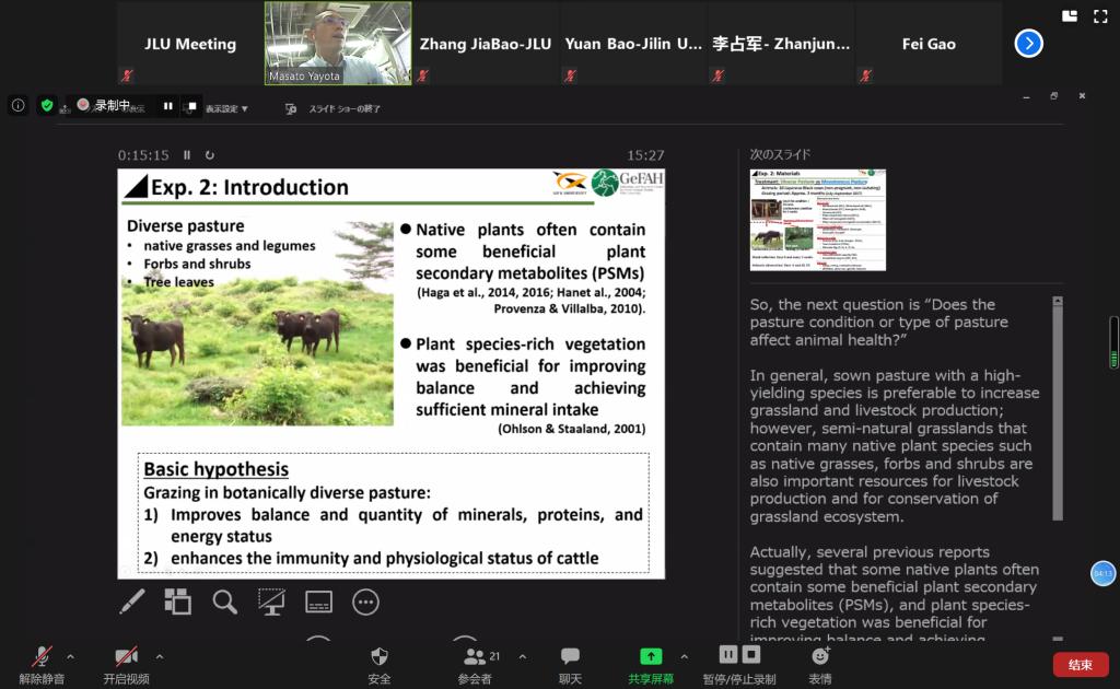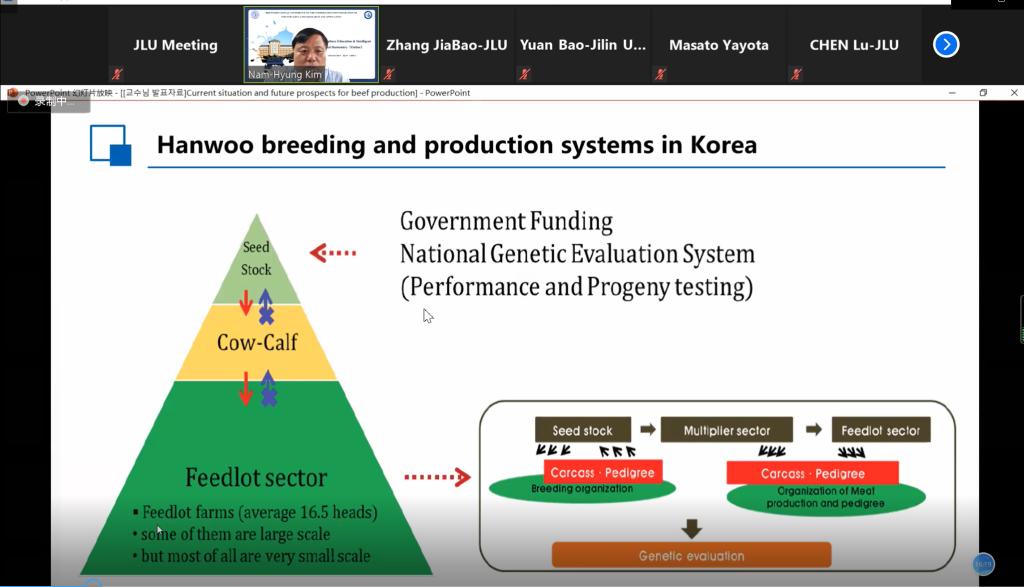 随后,俄罗斯联邦国家预算机构全俄养马研究所扎伊采夫·亚历山大所长,韩国忠北国立大学金南衡院士,国家高层次人才、beat365英国官方网站生物技术系李占军教授,日本国立岐阜大学应用生物科学部八代田真人教授、日本鹿儿岛大学农学部农业自然科学系後藤贵文和沈阳农业大学畜牧兽医学院院长张树义教授先后做了专题题为“Current situation and future prospects for beef production in South Korea and China”“Generation of Humanized rabbit models by improved CRISPR gene editing system.”“Potential of metabolic programming in beef production”““Potentials of grazing on animal health and welfare.”“A review of animal science research.”的学术报告,与会专家学者就专家报告具体内容和新农科建设主题开展了深入的交流。