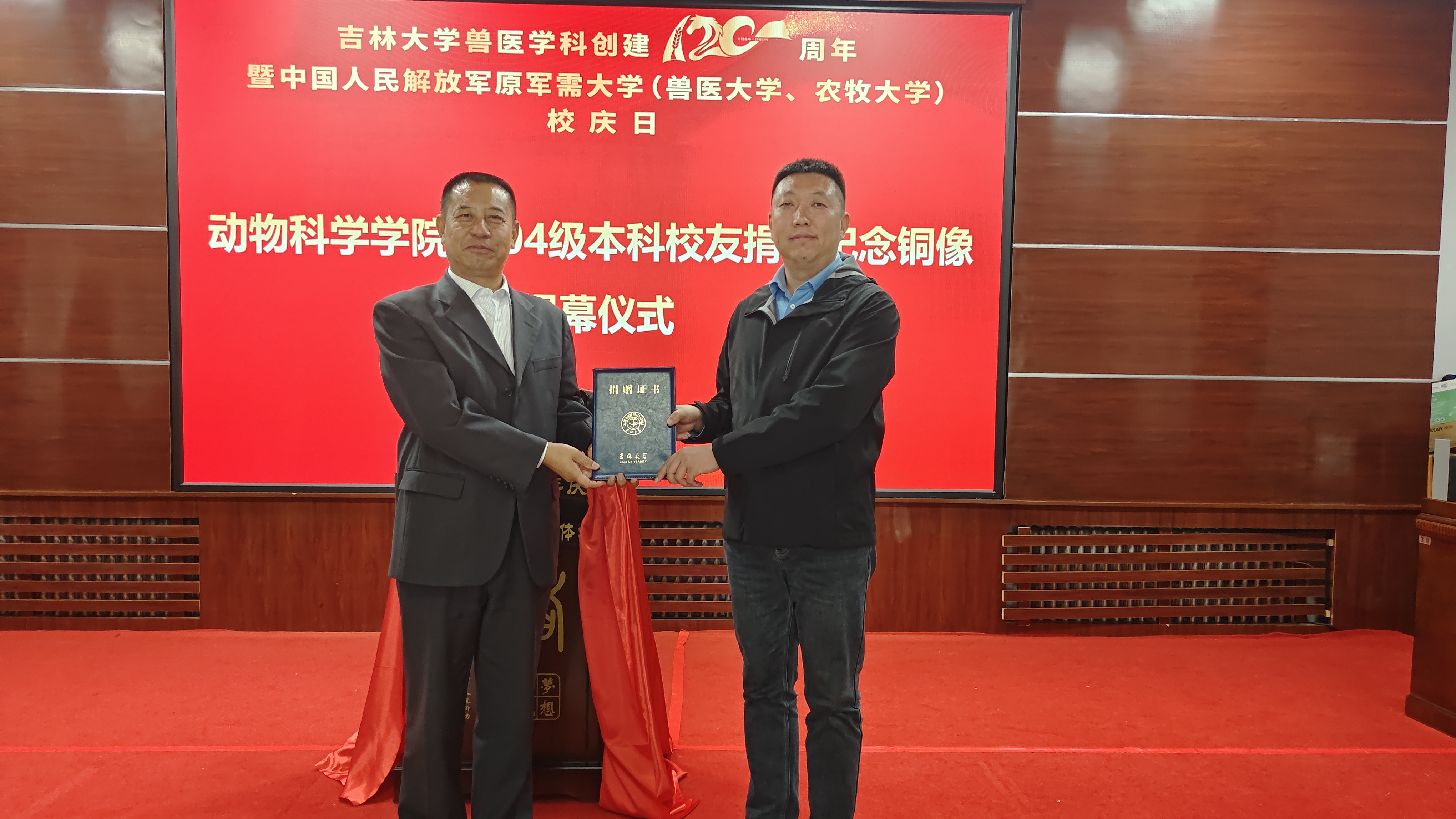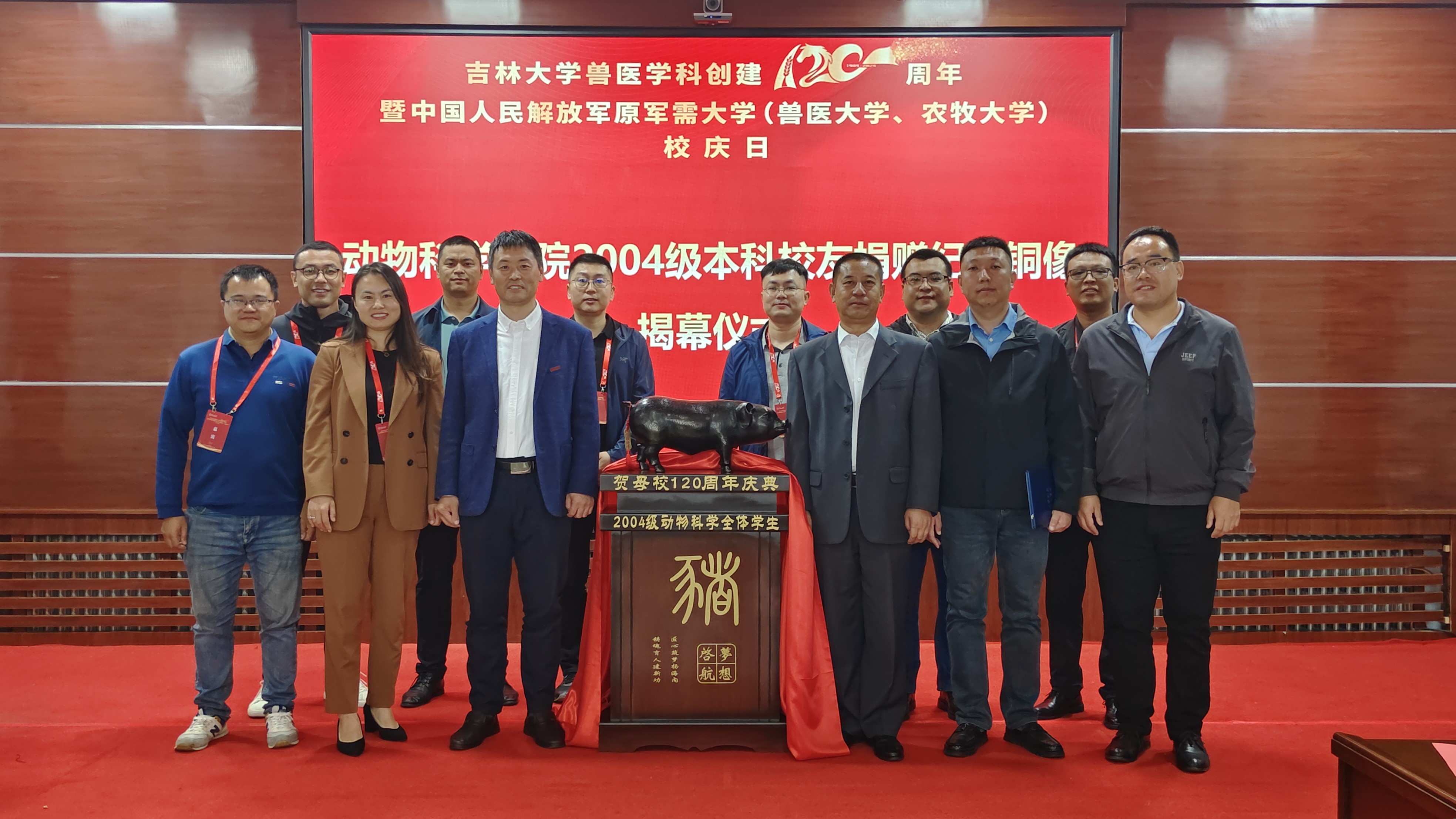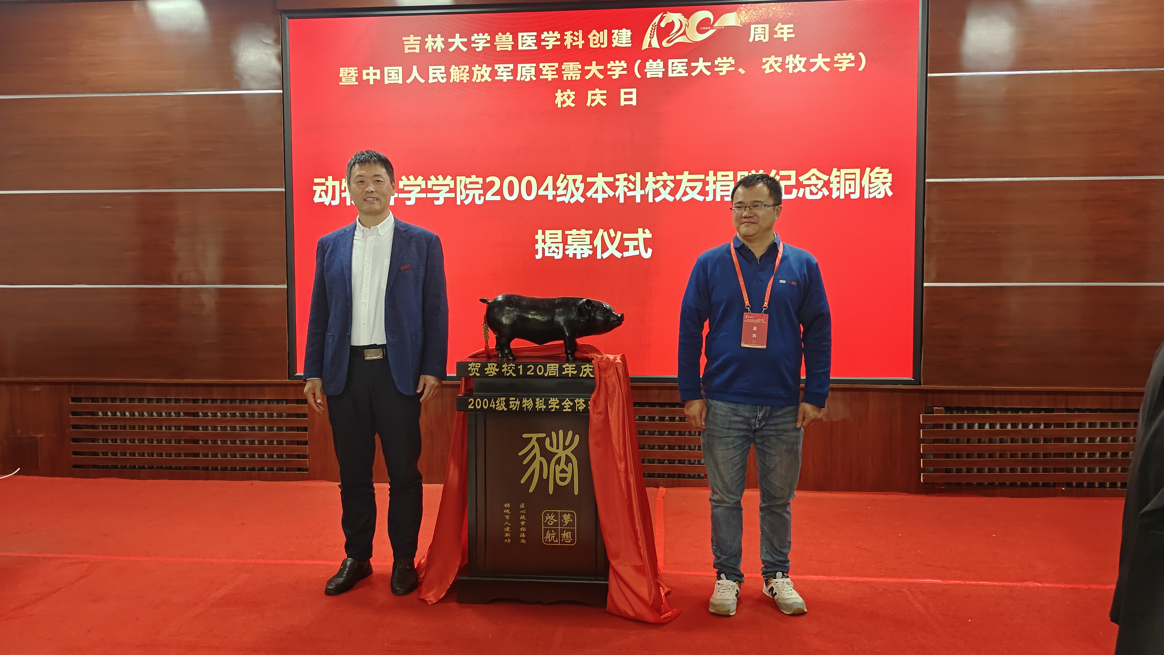 喜迎beat365英国官方网站兽医学科创建120周年暨中国人民解放军原军需大学(兽医大学、农牧大学)校庆,为寄托对母校的深切情谊,感恩母校,传递力量,beat365英国官方网站于9月20日和21日下午分别举办返校校友捐赠仪式。92级校友代表、斯贝福(北京)生物技术有限公司首席执行官战大伟为学院捐赠了齐长庆先生铜像。学院2004级本科生校友为学院捐赠了吉祥物猪铜像和校友基金10000元整。
