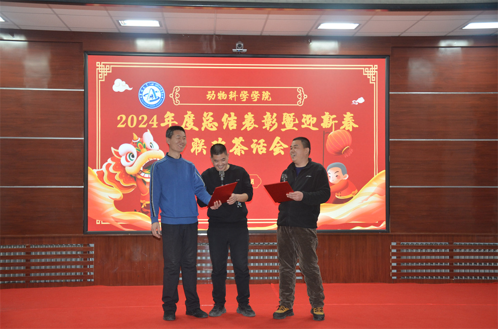最后,学院迎新春联欢茶话会在师生精心准备的节目表演和“默契接力”“蒙眼踏步”等互动游戏的轻松氛围中拉开帷幕。实验教学中心的老师们以一曲《小美满》手势舞表达了对学院师生的新年祝福,生物技术系博士后钱育强高歌一曲《天高地厚》诉说着对科研梦想的坚持,实验动物系教师们以一首《无奋斗,不青春》配乐诗朗诵寄语学院师生,让青春在奋斗中绽放光芒,学院机关3位教职工用方言朗诵经典《再别康桥》,唤起了大家对家乡方言的记忆和情感。表演和游戏中还穿插了抽奖环节,师生欢聚,惊喜连连,相信在新的一年里,学院师生将继续保持饱满的热情和昂扬的斗志,为学院“双一流”建设和高质量发展蓄势赋能,做出新的贡献。