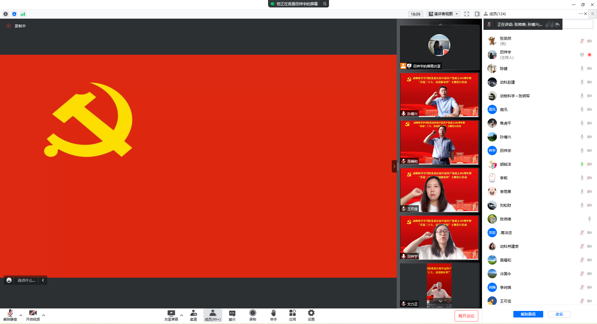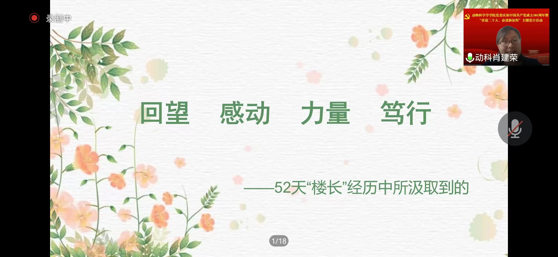 随后,学院疫情防控一线教职工党员代表肖建荣、王可佳、蒋洪忠和胡进平4位同志联合开展“党课开讲啦”,用生动的图片和鲜活的事例分享了他们在校园疫情防控和生产一线工作中的感人故事。肖建荣副书记以《回望·感动·力量·笃行》为题,分享了她带病上阵,在校园防疫一线担任52天“楼长”的感动与收获;辅导员王可佳以“春天里的故事”为题讲述了驻校时间最长、岗位变化最多的楼长与她学生们的双向奔赴;蒋洪忠老师用朴实却坚定的语言生动诠释了“召之能战、战之必胜”的“军人本色”;胡进平老师则细数学院生产一线的7位同志从冰雪覆盖到春暖花开再到夏日到来一路的艰辛与坚守......讲不完的故事,道不尽的感动,4位党员同志用他们的实际行动为学院师生筑起一道坚强的防疫屏障,他们是校园防疫一线的一抹“动科红”。