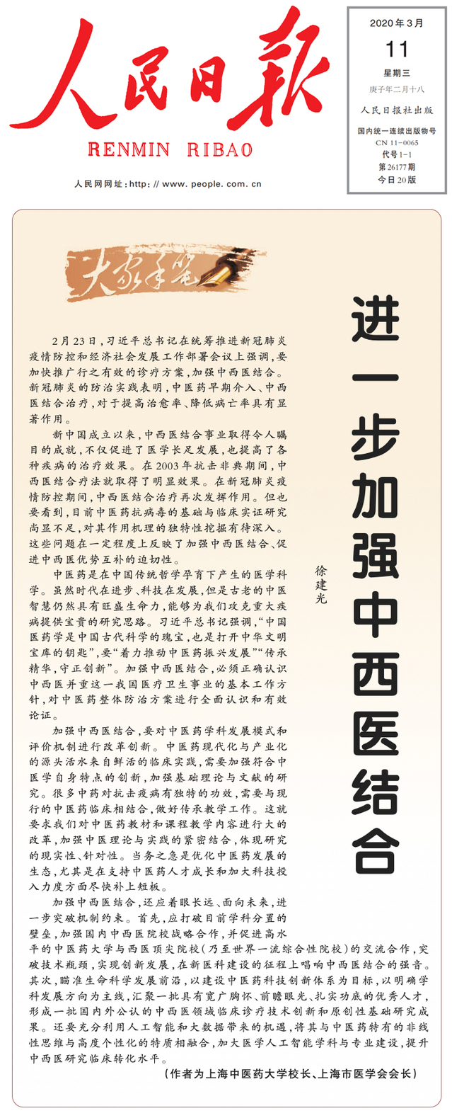 徐建光校长2020年03月11日在人民日报发表题为《进一步加强中西医结合》的文章