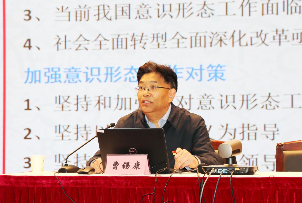 曹锡康首先明确意识形态的基本概念,随后就意识形态工作的重要性、建国以来我国意识形态领域的重要变化以及加强意识形态工作对策做了全面的解读。曹锡康用生动形象的图片和故事对意识形态相关问题进行解释,让大家对意识形态工作有了更直观的感受和更深的认识。