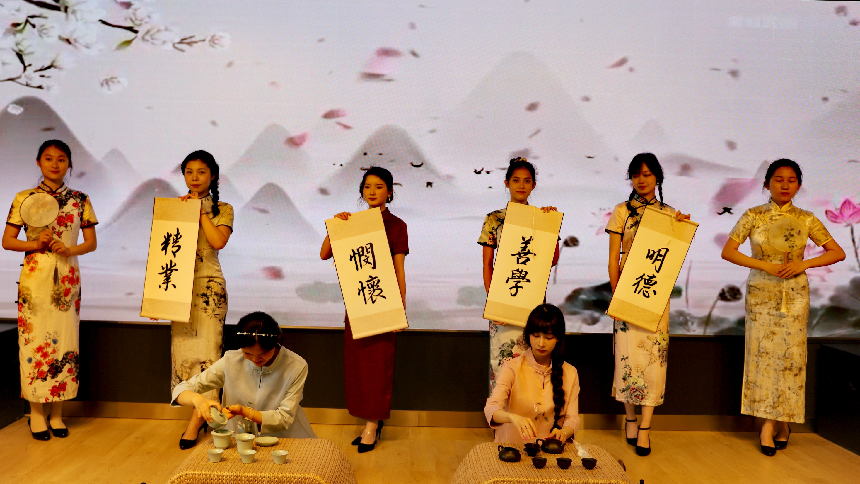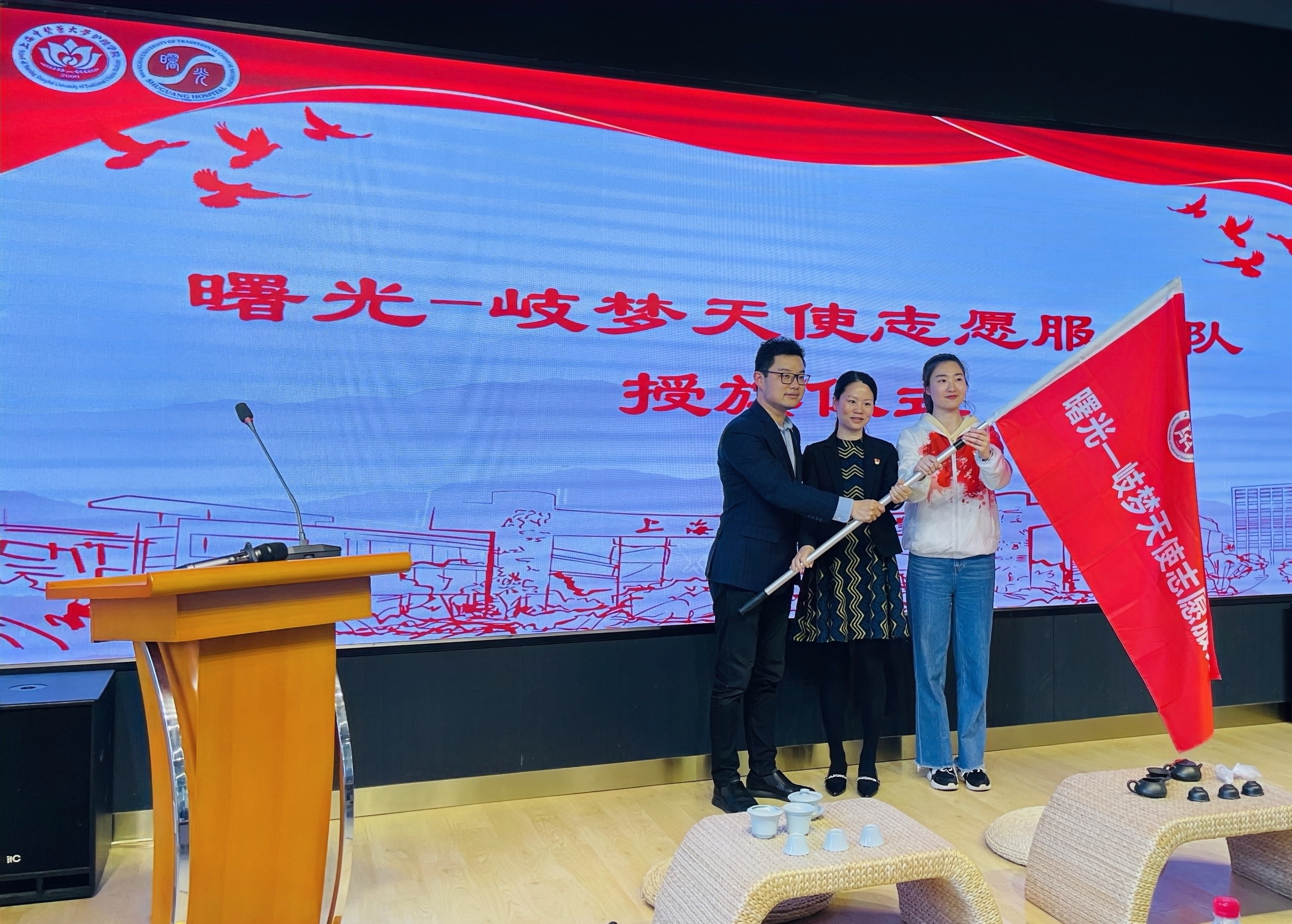 签约仪式上,吴平为护理学院志愿者服务队学生代表授旗。护理学院特色品牌“淑女学堂”的学员现场带来颇具东方意蕴的旗袍茶艺、书法文化秀,将美育融入学生日常教育中。