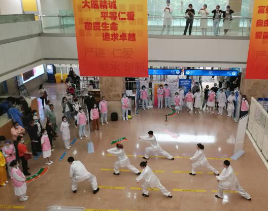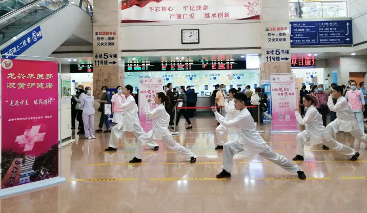 中医养生操具有悠久的历史,其动作简单、缓和,具有强身健体调整锻炼者的呼吸达到舒畅心情等功效。龙华医院养生功法爱好者们在门诊大厅为患者们带来了一场精彩养生功法快闪,吸引了民众驻足观看学习。