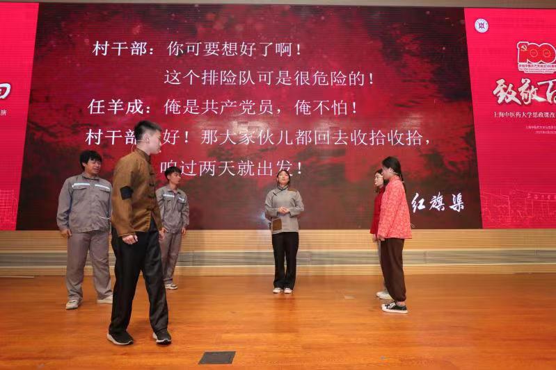 “红旗渠,一条位于河南省林州市的‘人工天渠’,是林县的人民用十年时间克服一切困难,人工开凿了这条悬挂在太行山一块绝壁上的‘天渠’,它不单单是一项水利工程,更锻造出了气壮山河的‘红旗渠精神’。”来自河南的三位学生带领表演团队用河南方言讲述发生在家乡的这个故事。因为共鸣共情和文化认同,现场观众沉浸其中,接受精神洗礼。还有《中共一大会址的故事》《半条被子》等情景剧,都是大学生在思政课教师指导下自编自演,虽然在展演过程中还显得有些“青涩”,但是这一教学形式作为一种很好的自我教育、朋辈教育方式,已透露出学生们喜欢的“味道”。