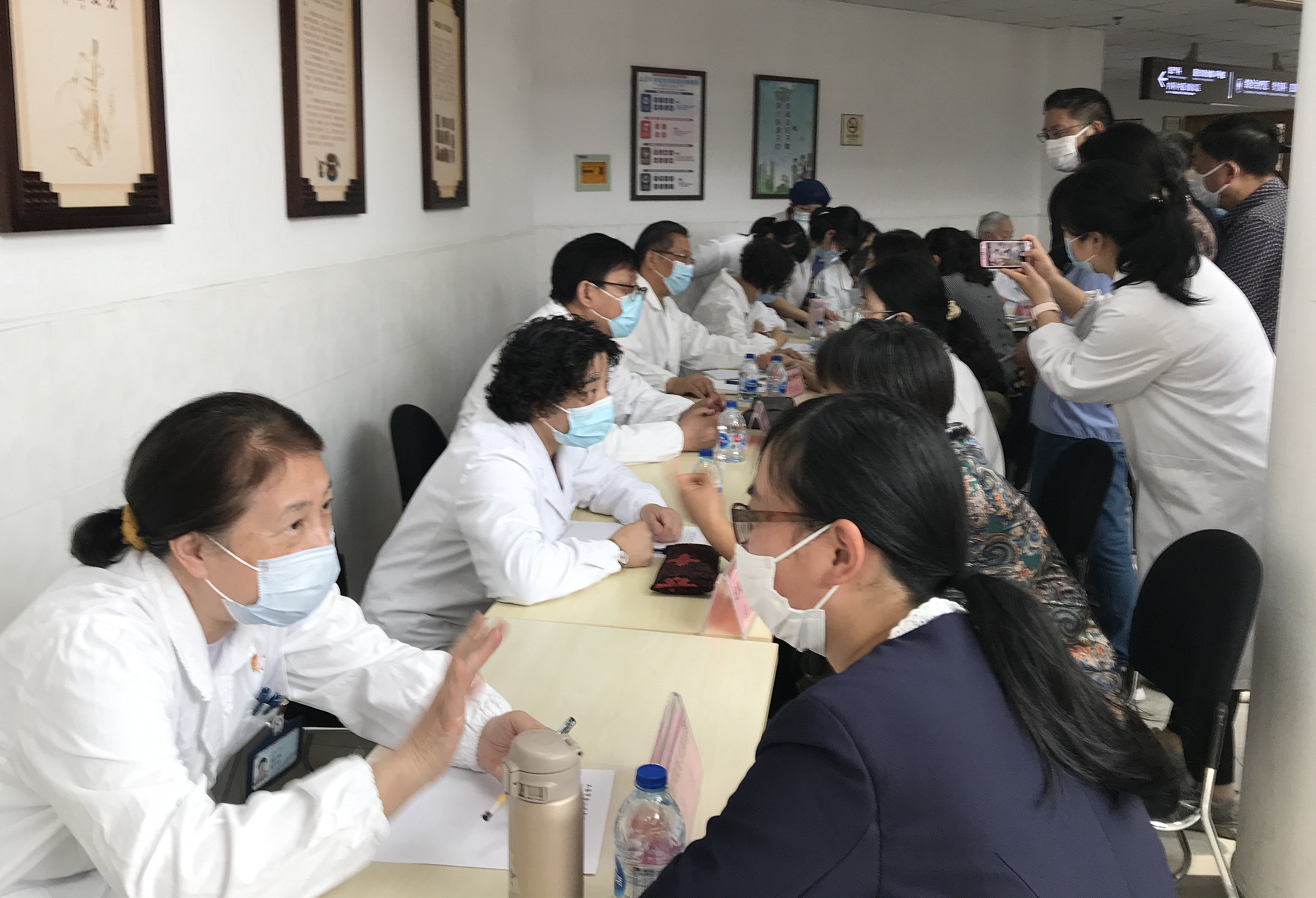 赠书仪式后,党员专家团队开始了服务社会百姓活动,向当地病患百姓提供医疗和护理咨询服务。龙华医院肿瘤科徐振晔教授、心病科顾仁樾教授、骨伤科赵光复教授、眼科李明飞主任医师、脾胃病科郑嘉岗主任医师等医疗专家团队9位党员,为前来咨询的群众答疑解惑;护理团队的3位专家为百姓们提供测量血压、免费监测血糖等服务;志愿者团队为群众发放健康保健处方、分科引导、指导合理锻炼及膳食等服务。整整2个小时的义诊服务,共接待群众130多名。专家团队中已进入耄耋之年的顾仁樾教授和赵光复教授,不顾自己年事已高,始终坚守岗位,为每一位咨询者耐心解答、看片读片。