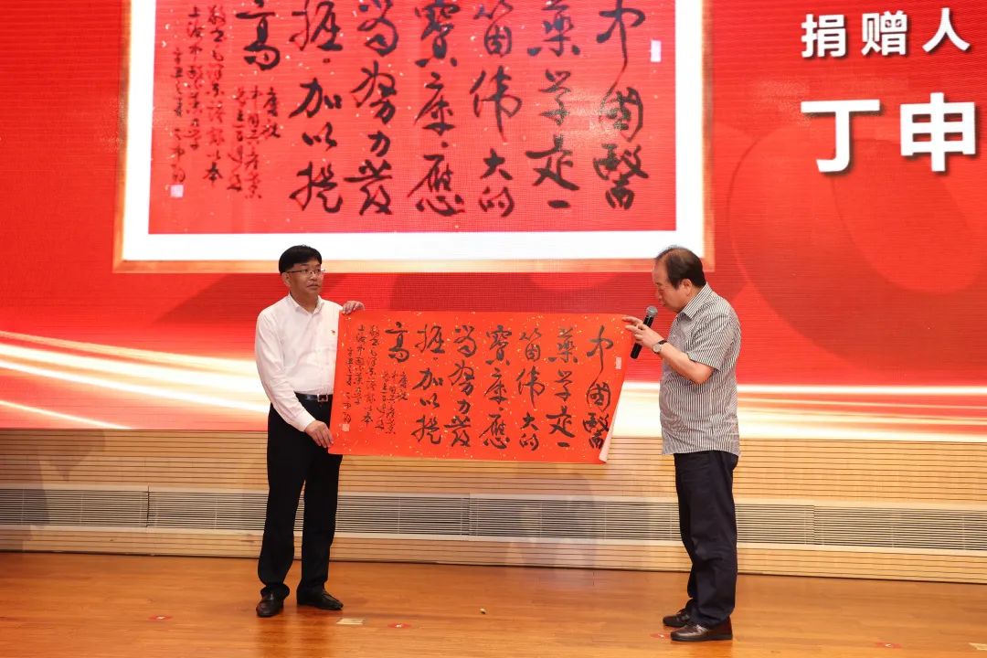 bat365官网客座教授、上海市书法家协会主席丁申阳向学校捐赠一幅书法作品,内容为毛泽东同志对中医药作出的重要指示“中国医药学是一个伟大的宝库,应当努力发掘,加以提高”,鼓励学校师生在中医药守正创新、传承发展之路上开拓进取,不懈奋斗。